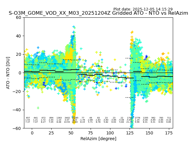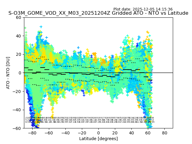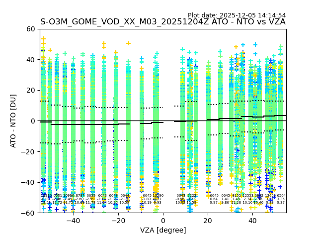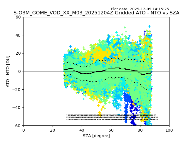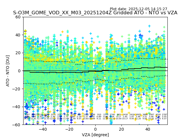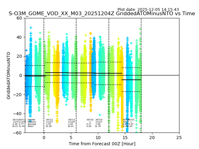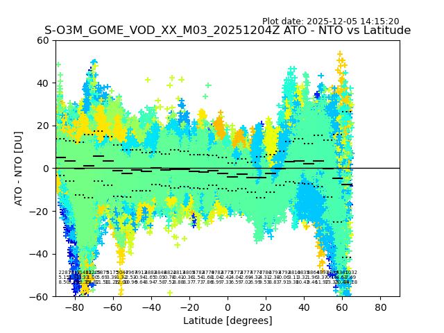 The date given in the title of the plot indicates the T=0 day for which the NTO/O3 data is compared. Example: S-O3M_GOME_VOD__M02_20110117Z indicates that the plot is for data from 2011-01-17 00:00 up NTO/O3 files starting at 2011-01-17 23:59 is used.