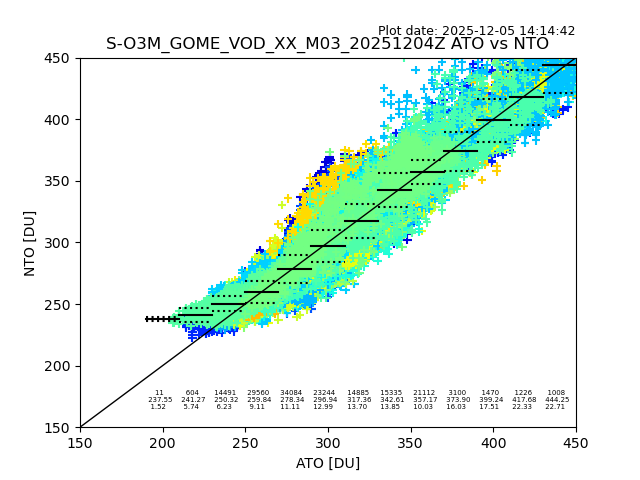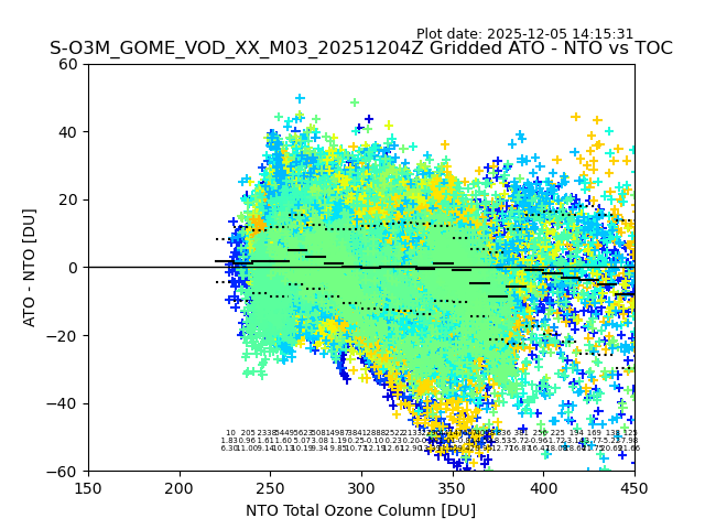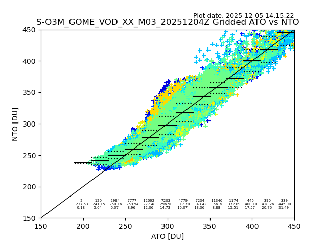 Using these forecast fields, the actual measured NTO/O3 from T=0 to T+24h can be compared. The comparison can be between each individual NTO/O3 retrieval and the ATO value in the associated grid box, or between 'pre-gridded' NTO/O3 values and the ATO value. Both these comparisons are given.