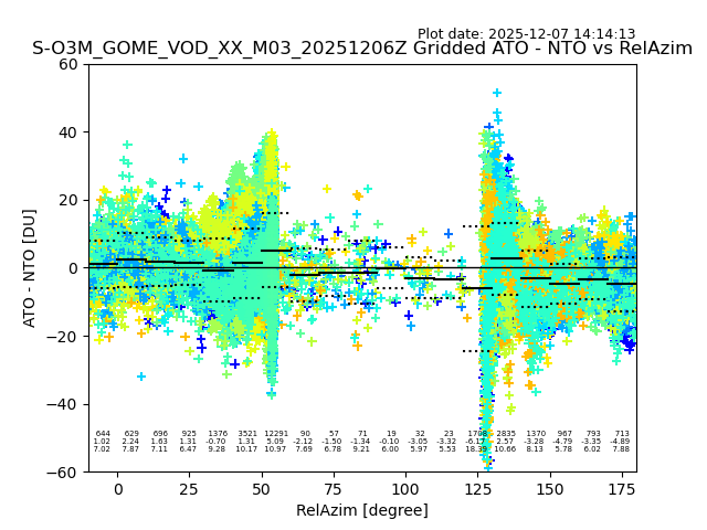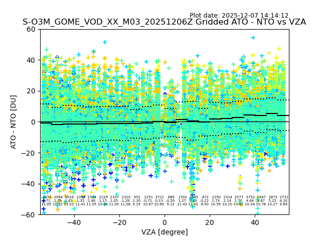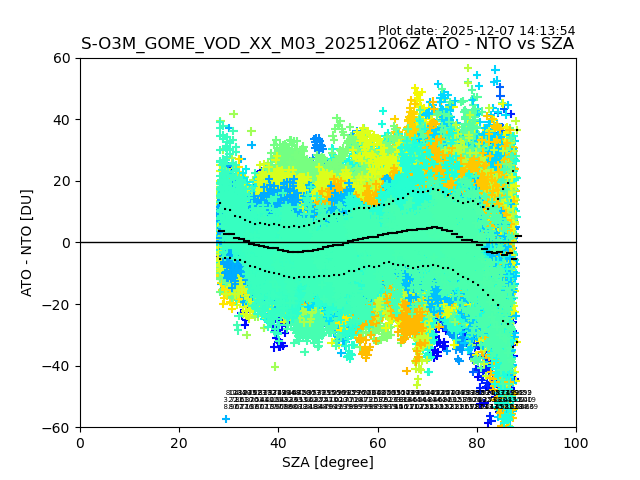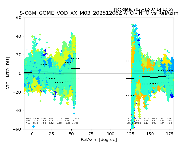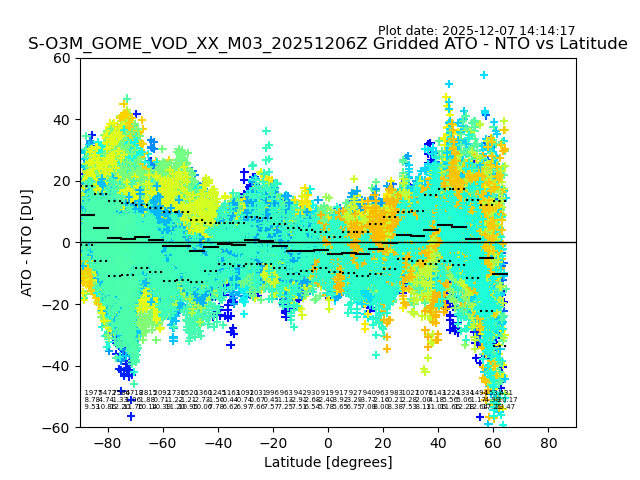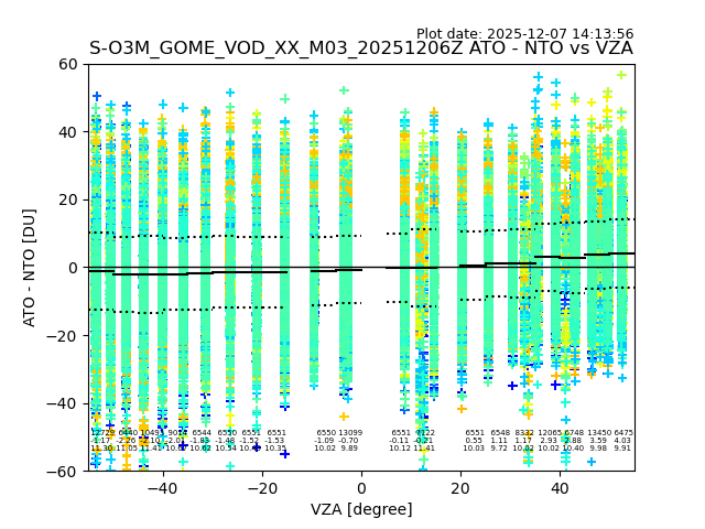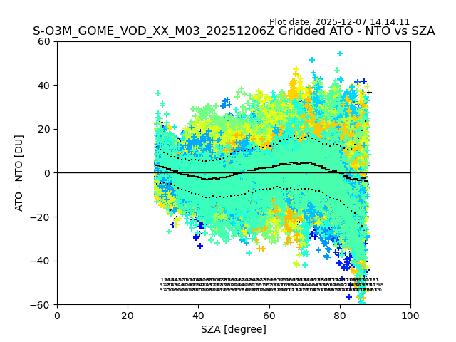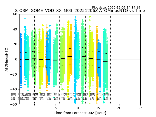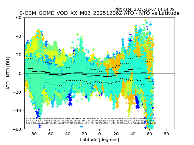 The date given in the title of the plot indicates the T=0 day for which the NTO/O3 data is compared. Example: S-O3M_GOME_VOD__M02_20110117Z indicates that the plot is for data from 2011-01-17 00:00 up NTO/O3 files starting at 2011-01-17 23:59 is used.