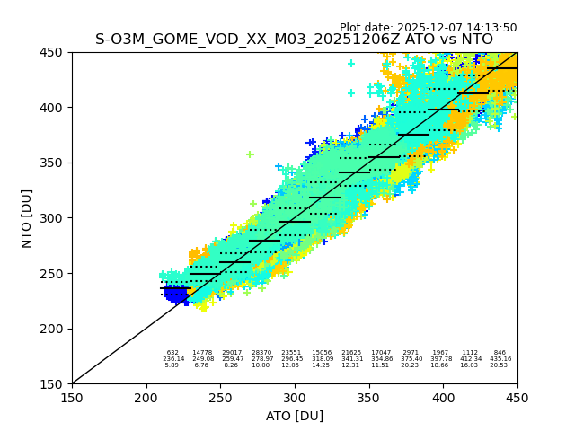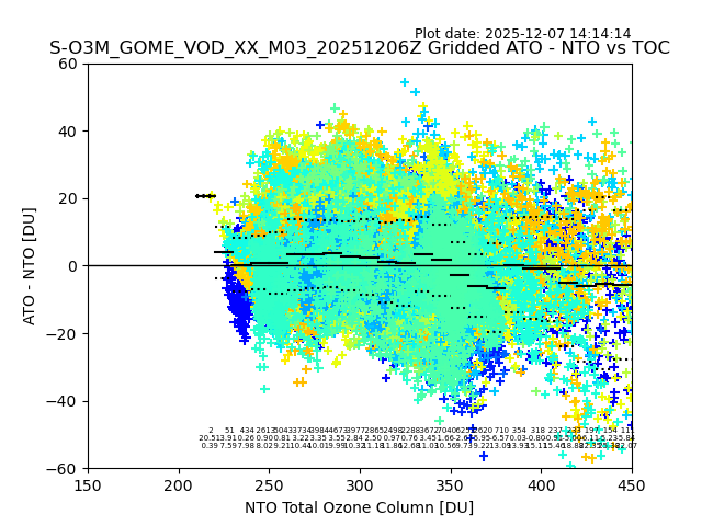 Using these forecast fields, the actual measured NTO/O3 from T=0 to T+24h can be compared. The comparison can be between each individual NTO/O3 retrieval and the ATO value in the associated grid box, or between 'pre-gridded' NTO/O3 values and the ATO value. Both these comparisons are given.