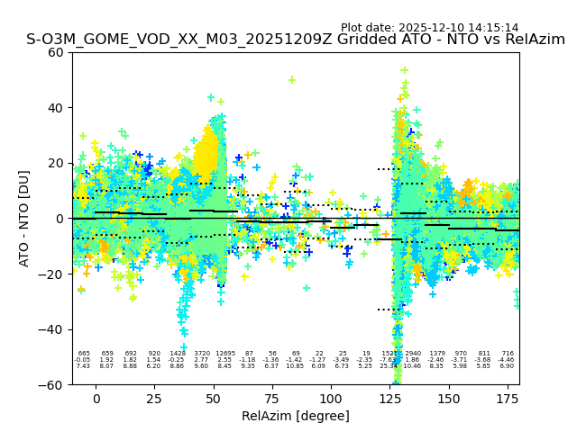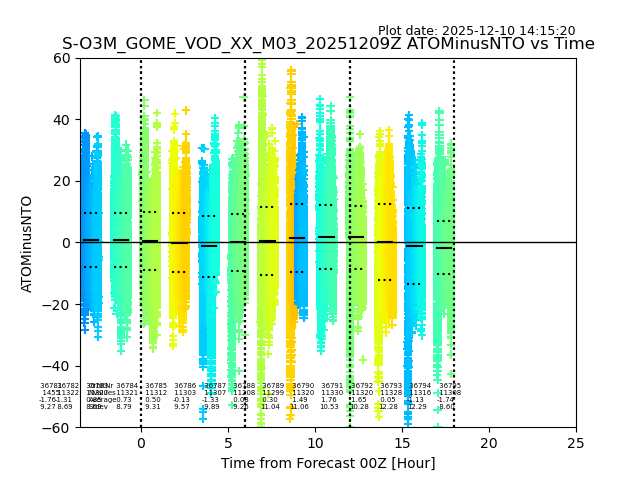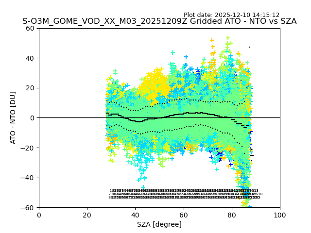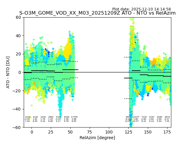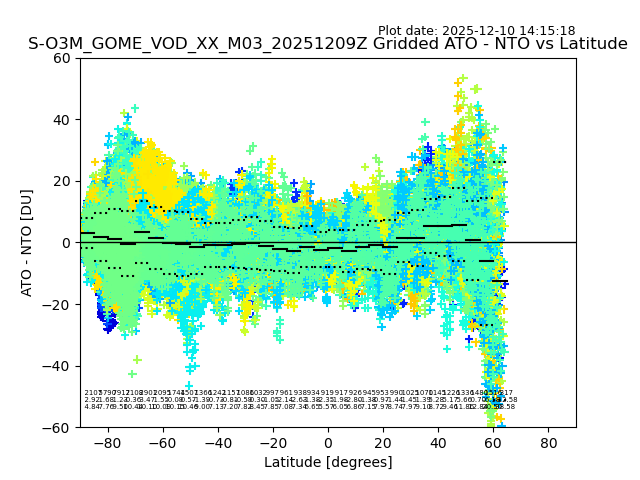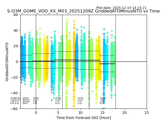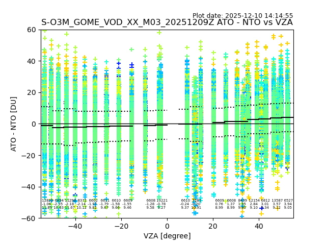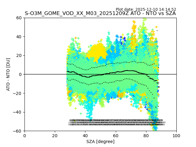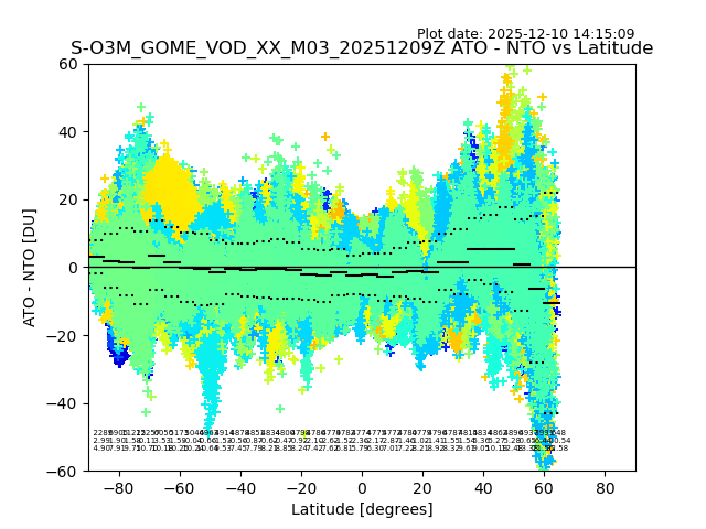 The date given in the title of the plot indicates the T=0 day for which the NTO/O3 data is compared. Example: S-O3M_GOME_VOD__M02_20110117Z indicates that the plot is for data from 2011-01-17 00:00 up NTO/O3 files starting at 2011-01-17 23:59 is used.