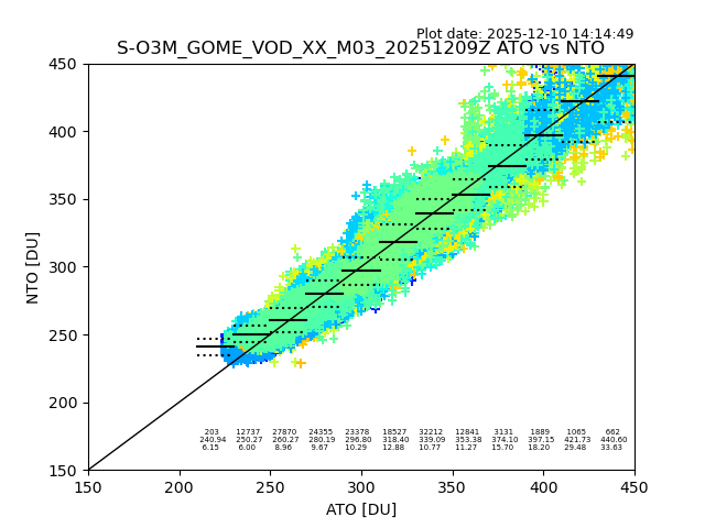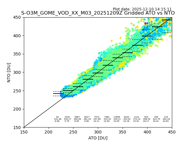 Using these forecast fields, the actual measured NTO/O3 from T=0 to T+24h can be compared. The comparison can be between each individual NTO/O3 retrieval and the ATO value in the associated grid box, or between 'pre-gridded' NTO/O3 values and the ATO value. Both these comparisons are given.