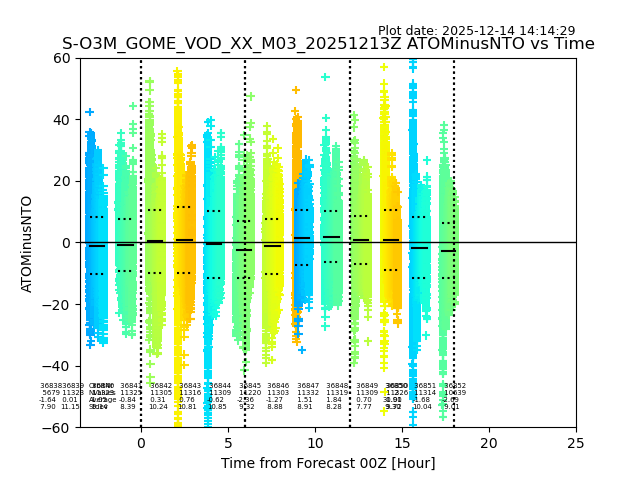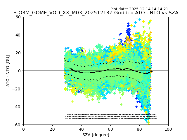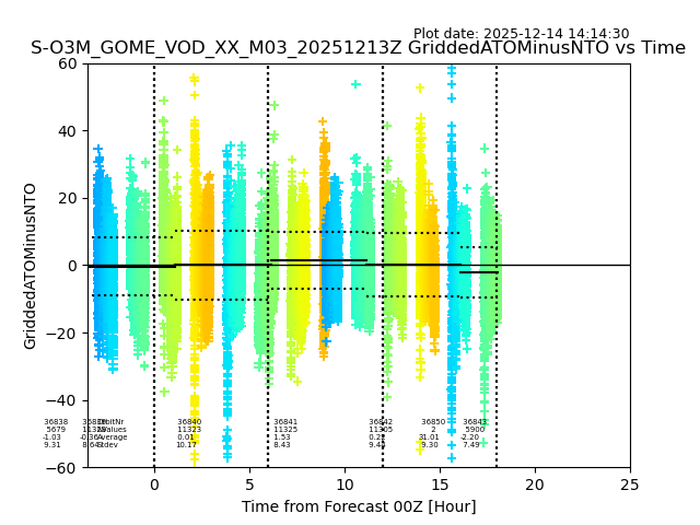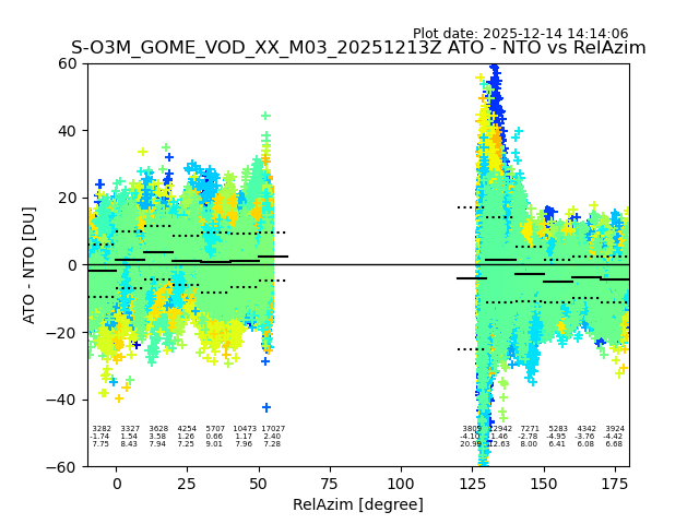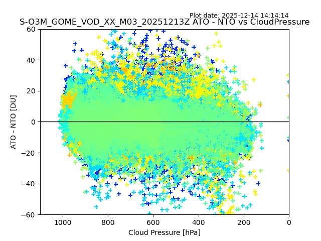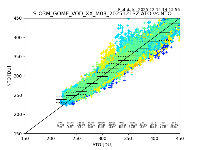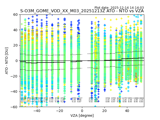 The date given in the title of the plot indicates the T=0 day for which the NTO/O3 data is compared. Example: S-O3M_GOME_VOD__M02_20110117Z indicates that the plot is for data from 2011-01-17 00:00 up NTO/O3 files starting at 2011-01-17 23:59 is used.