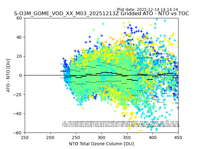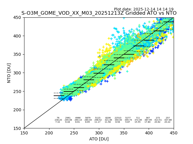 Using these forecast fields, the actual measured NTO/O3 from T=0 to T+24h can be compared. The comparison can be between each individual NTO/O3 retrieval and the ATO value in the associated grid box, or between 'pre-gridded' NTO/O3 values and the ATO value. Both these comparisons are given.