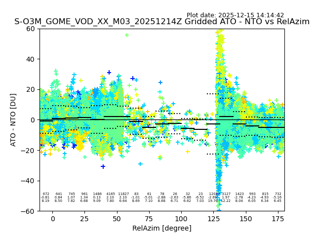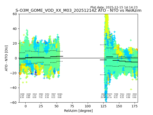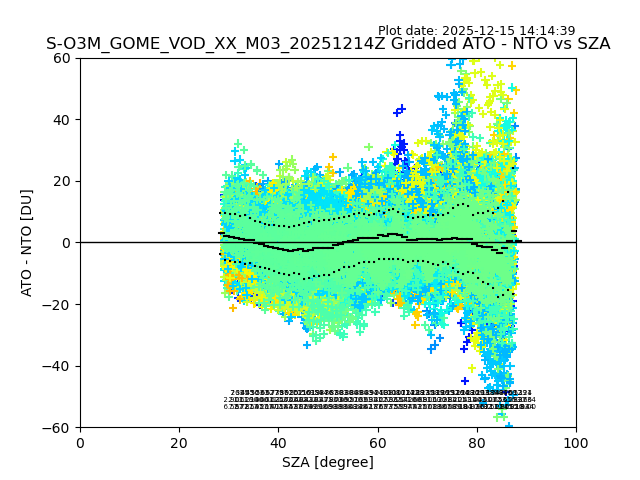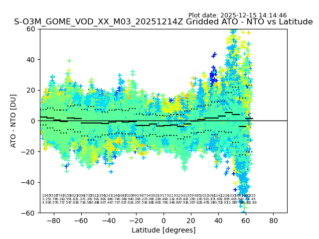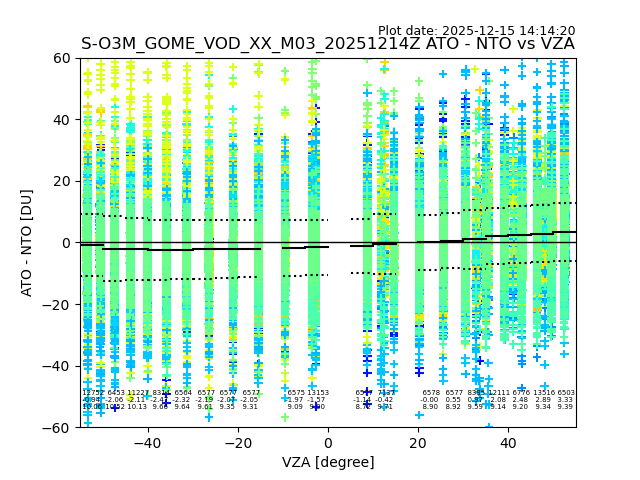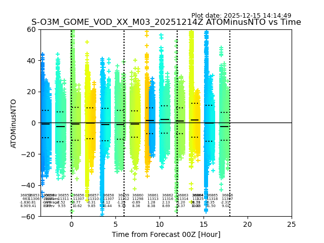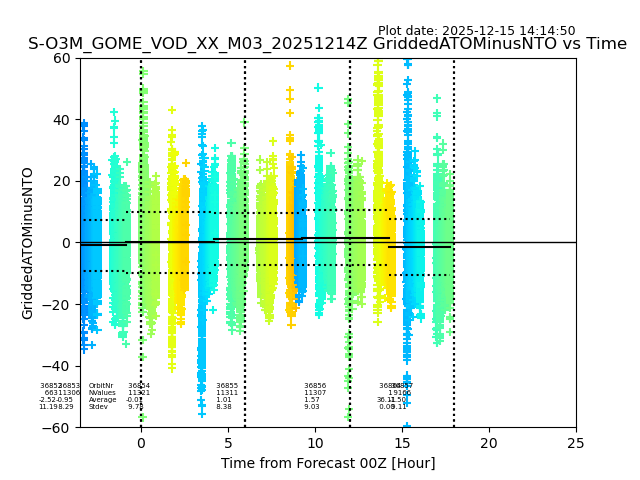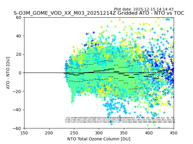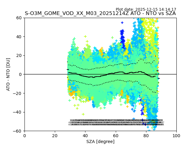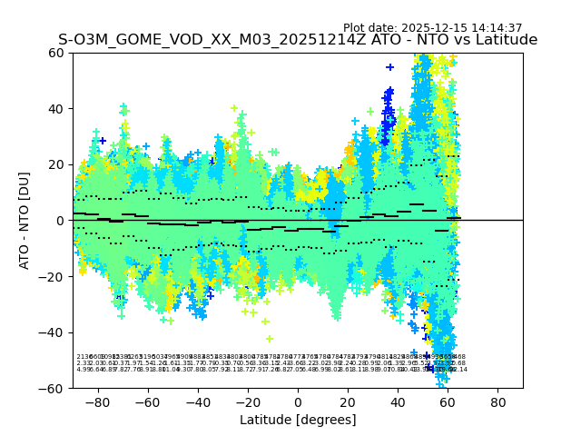 The date given in the title of the plot indicates the T=0 day for which the NTO/O3 data is compared. Example: S-O3M_GOME_VOD__M02_20110117Z indicates that the plot is for data from 2011-01-17 00:00 up NTO/O3 files starting at 2011-01-17 23:59 is used.
