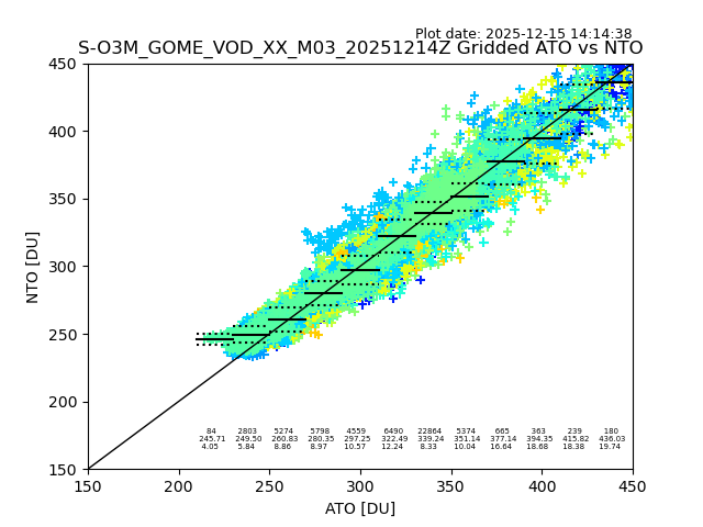 Using these forecast fields, the actual measured NTO/O3 from T=0 to T+24h can be compared. The comparison can be between each individual NTO/O3 retrieval and the ATO value in the associated grid box, or between 'pre-gridded' NTO/O3 values and the ATO value. Both these comparisons are given.