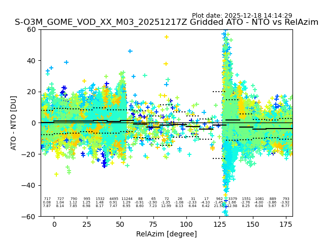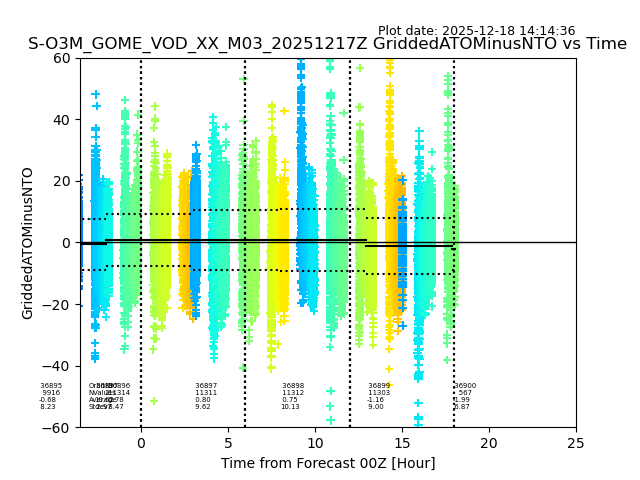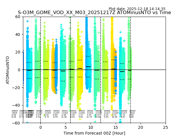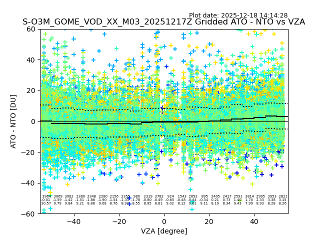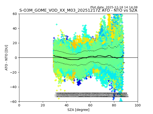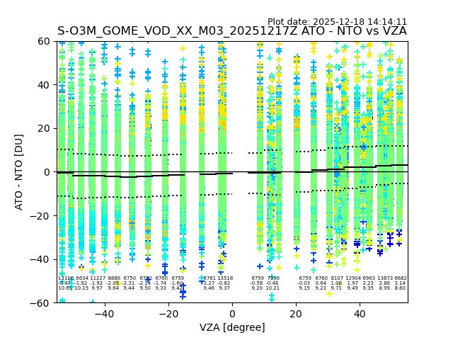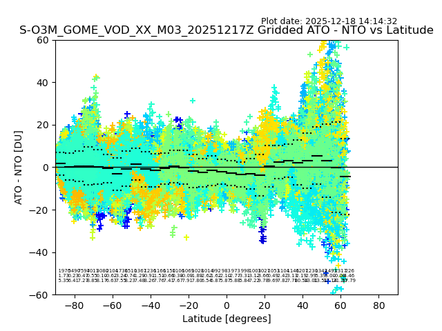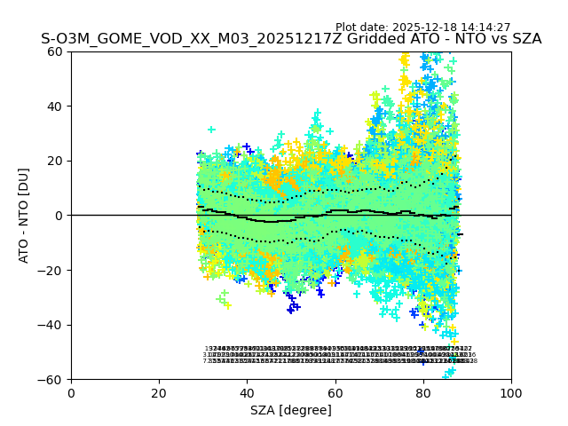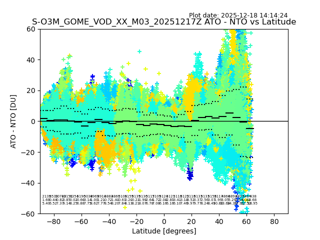 The date given in the title of the plot indicates the T=0 day for which the NTO/O3 data is compared. Example: S-O3M_GOME_VOD__M02_20110117Z indicates that the plot is for data from 2011-01-17 00:00 up NTO/O3 files starting at 2011-01-17 23:59 is used.