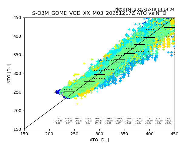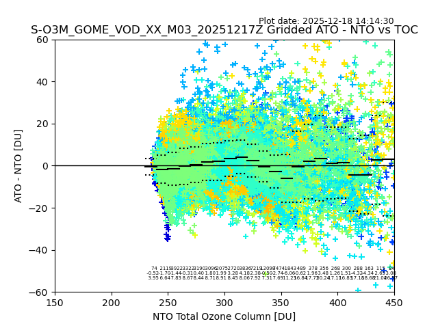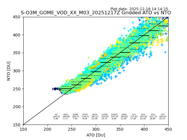 Using these forecast fields, the actual measured NTO/O3 from T=0 to T+24h can be compared. The comparison can be between each individual NTO/O3 retrieval and the ATO value in the associated grid box, or between 'pre-gridded' NTO/O3 values and the ATO value. Both these comparisons are given.