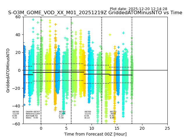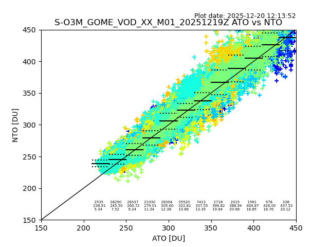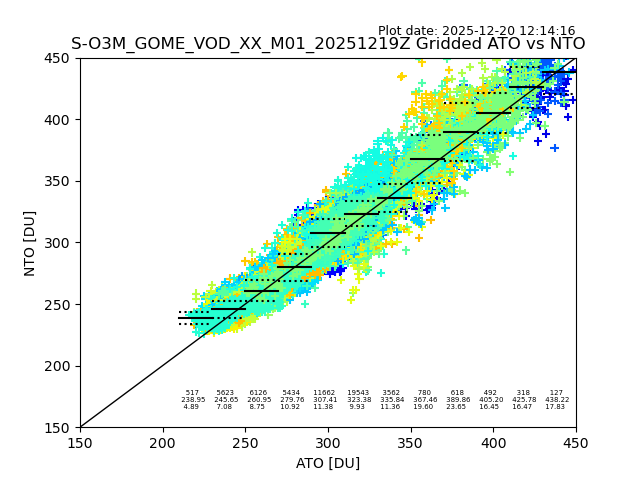 Using these forecast fields, the actual measured NTO/O3 from T=0 to T+24h can be compared. The comparison can be between each individual NTO/O3 retrieval and the ATO value in the associated grid box, or between 'pre-gridded' NTO/O3 values and the ATO value. Both these comparisons are given.
