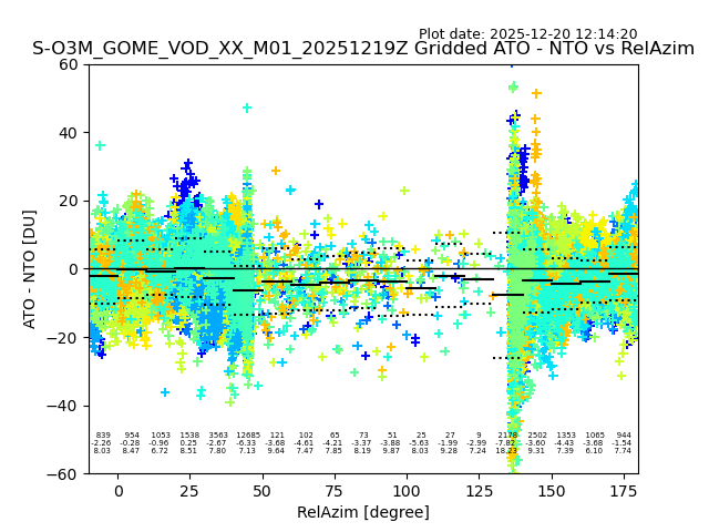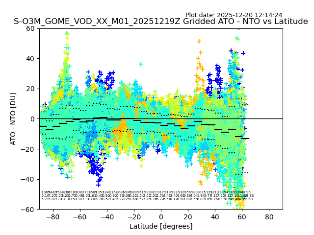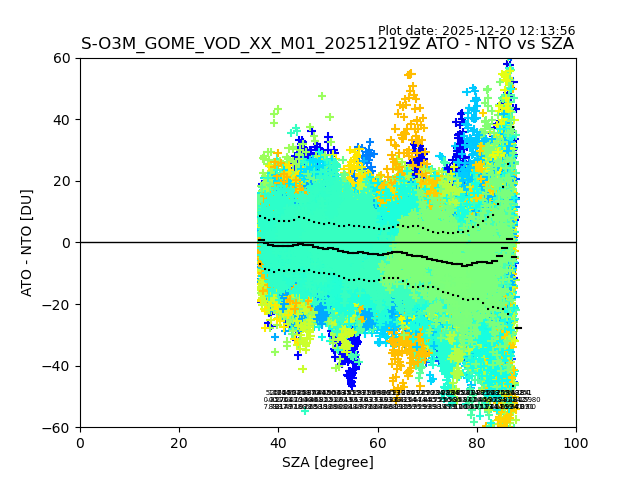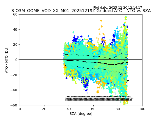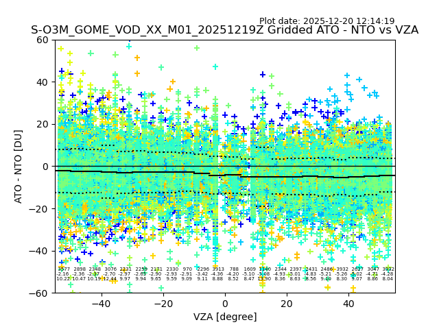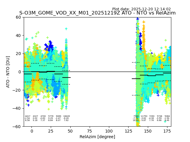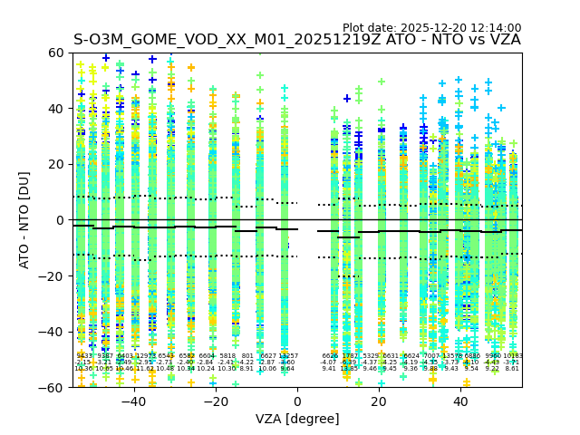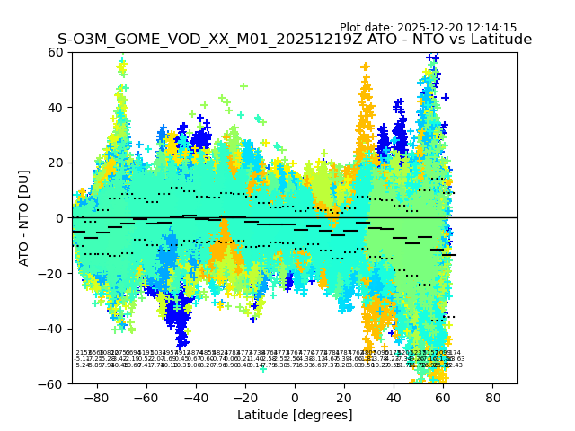 The date given in the title of the plot indicates the T=0 day for which the NTO/O3 data is compared. Example: S-O3M_GOME_VOD__M02_20110117Z indicates that the plot is for data from 2011-01-17 00:00 up NTO/O3 files starting at 2011-01-17 23:59 is used.
