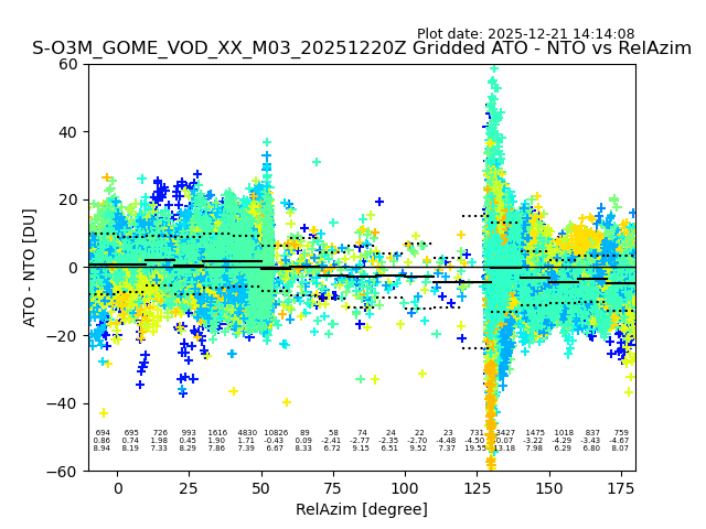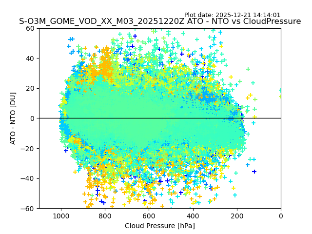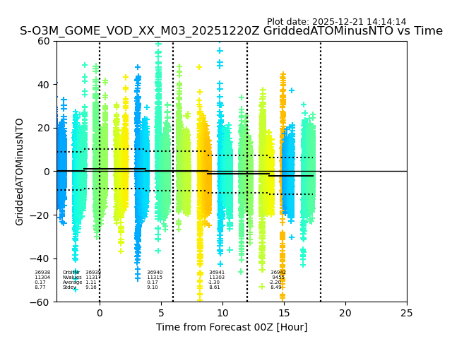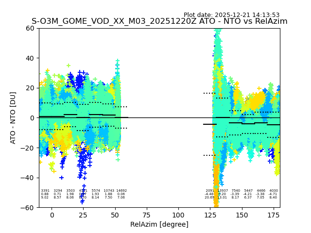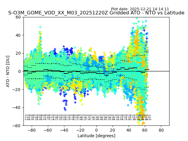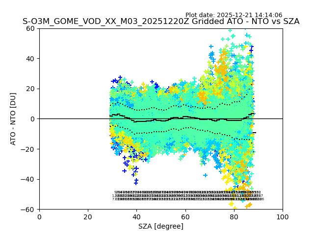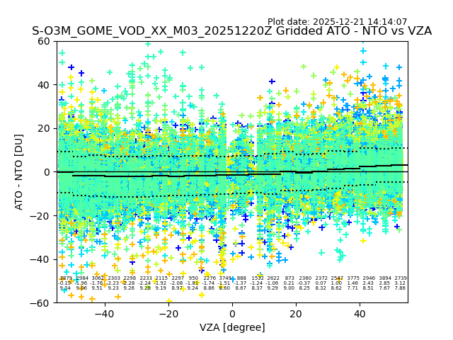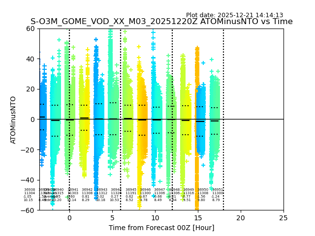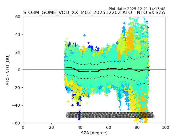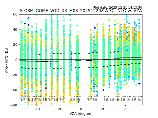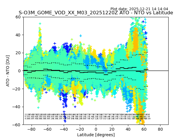The date given in the title of the plot indicates the T=0 day for which the NTO/O3 data is compared. Example: S-O3M_GOME_VOD__M02_20110117Z indicates that the plot is for data from 2011-01-17 00:00 up NTO/O3 files starting at 2011-01-17 23:59 is used.