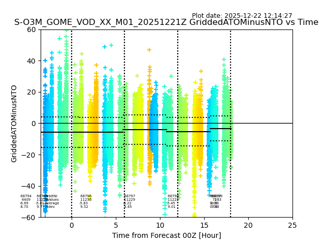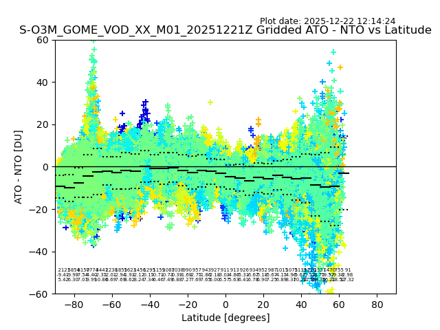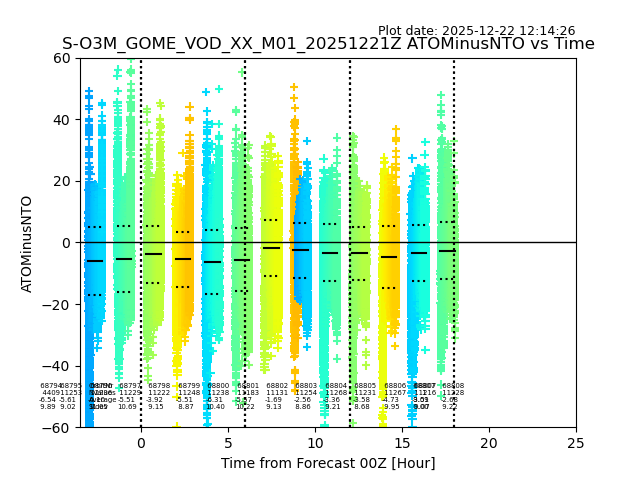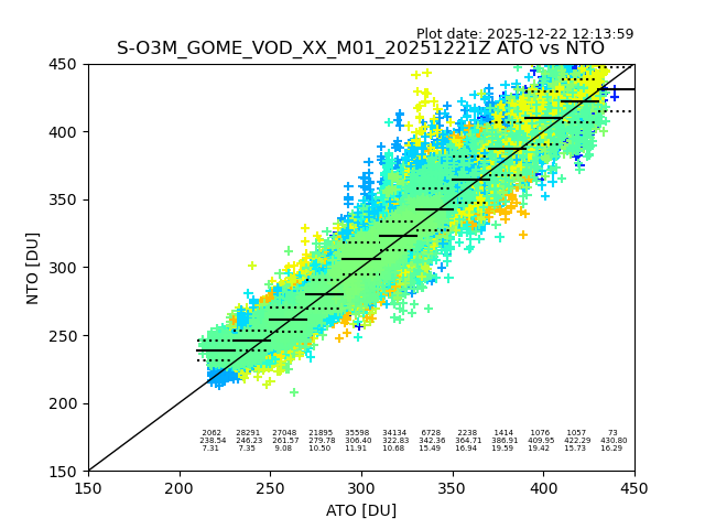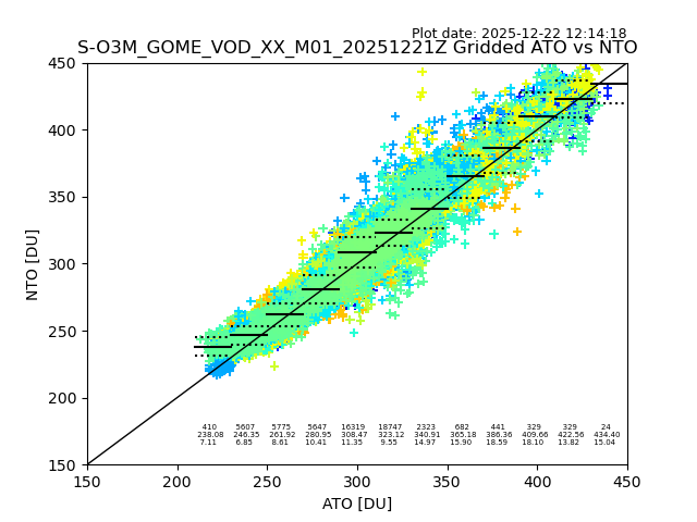 Using these forecast fields, the actual measured NTO/O3 from T=0 to T+24h can be compared. The comparison can be between each individual NTO/O3 retrieval and the ATO value in the associated grid box, or between 'pre-gridded' NTO/O3 values and the ATO value. Both these comparisons are given.