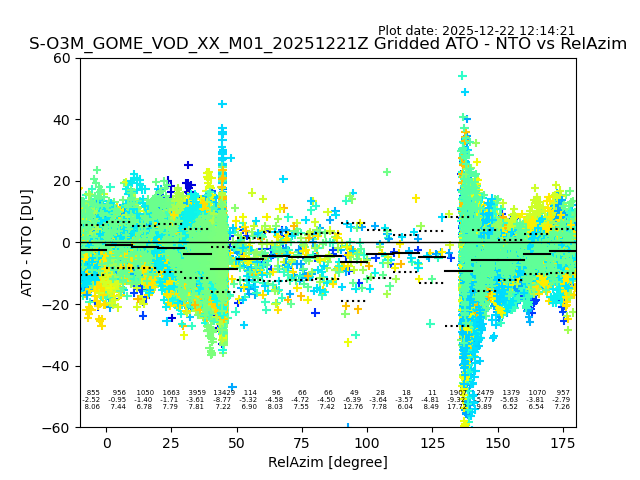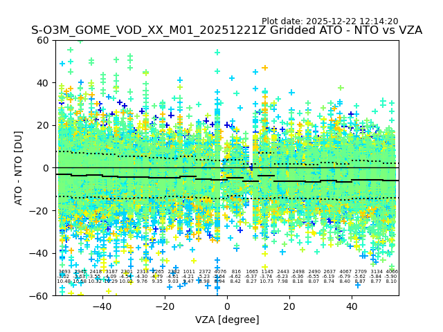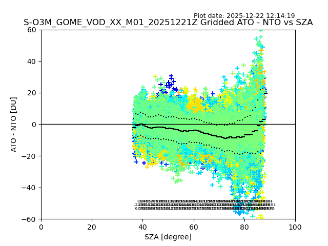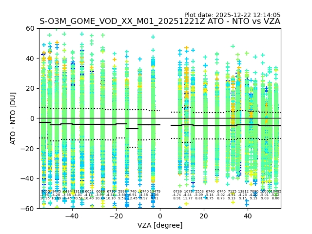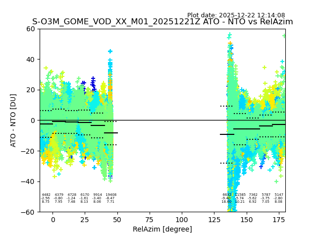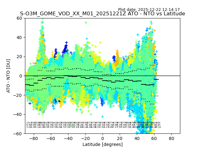 The date given in the title of the plot indicates the T=0 day for which the NTO/O3 data is compared. Example: S-O3M_GOME_VOD__M02_20110117Z indicates that the plot is for data from 2011-01-17 00:00 up NTO/O3 files starting at 2011-01-17 23:59 is used.