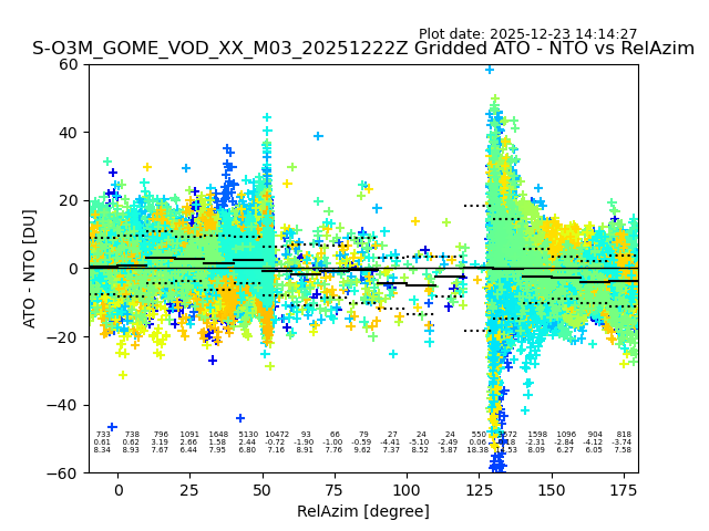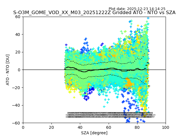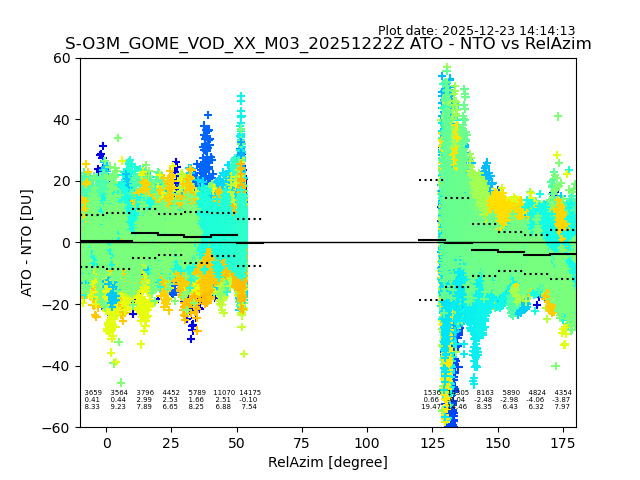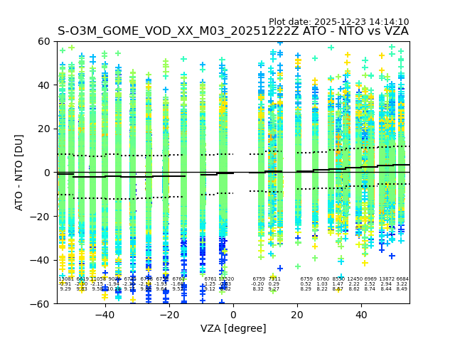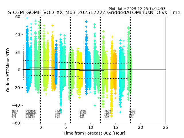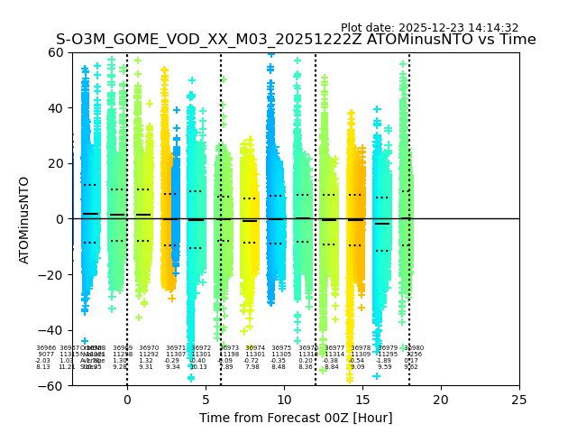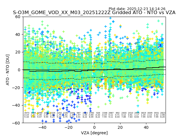 The date given in the title of the plot indicates the T=0 day for which the NTO/O3 data is compared. Example: S-O3M_GOME_VOD__M02_20110117Z indicates that the plot is for data from 2011-01-17 00:00 up NTO/O3 files starting at 2011-01-17 23:59 is used.