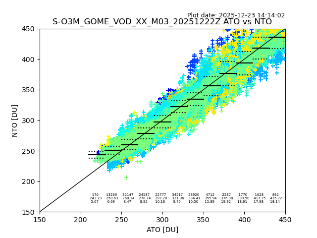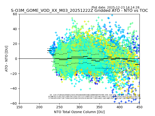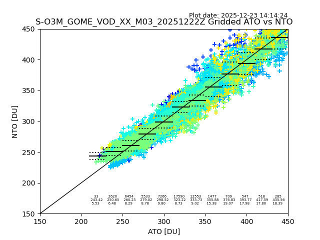 Using these forecast fields, the actual measured NTO/O3 from T=0 to T+24h can be compared. The comparison can be between each individual NTO/O3 retrieval and the ATO value in the associated grid box, or between 'pre-gridded' NTO/O3 values and the ATO value. Both these comparisons are given.
