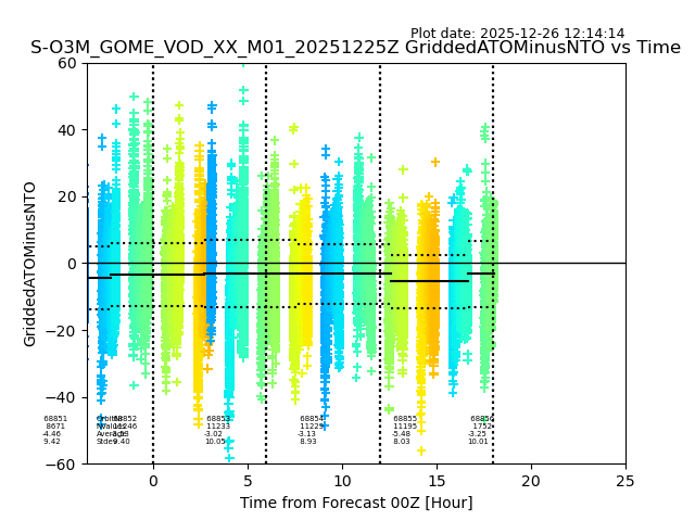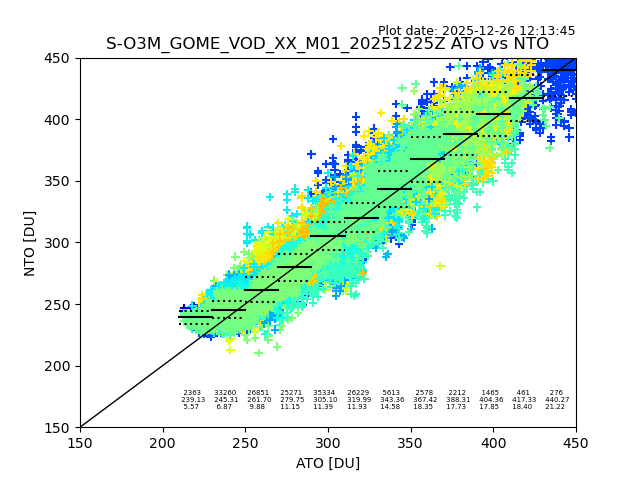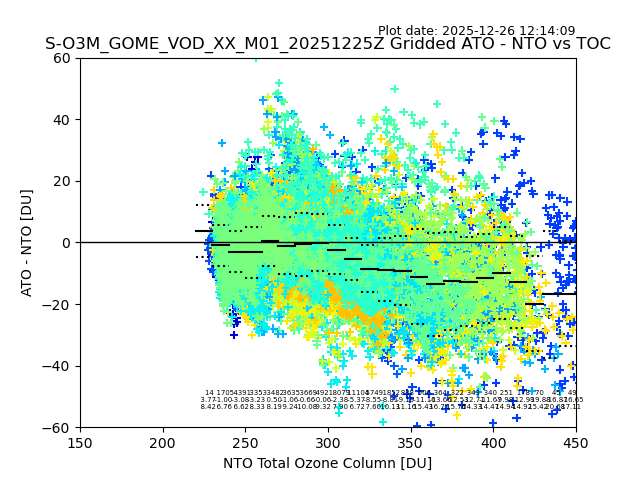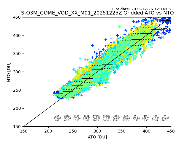 Using these forecast fields, the actual measured NTO/O3 from T=0 to T+24h can be compared. The comparison can be between each individual NTO/O3 retrieval and the ATO value in the associated grid box, or between 'pre-gridded' NTO/O3 values and the ATO value. Both these comparisons are given.