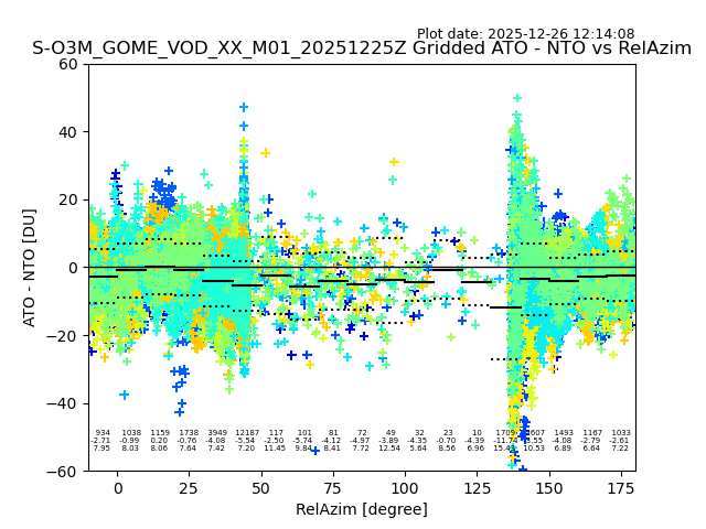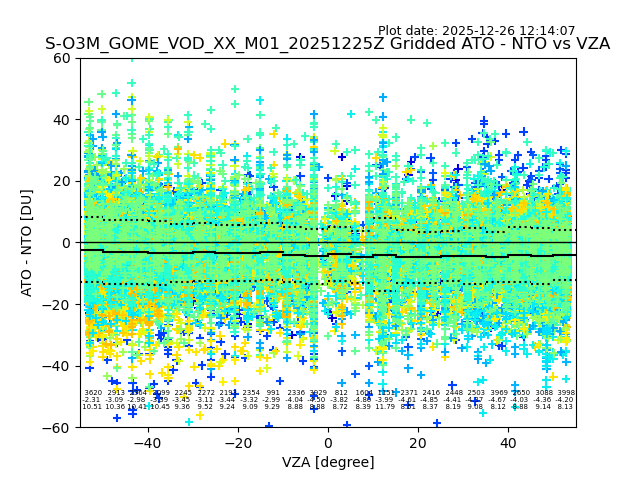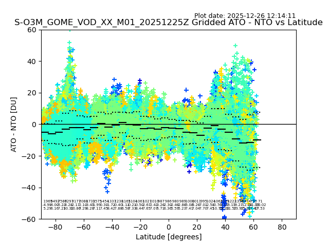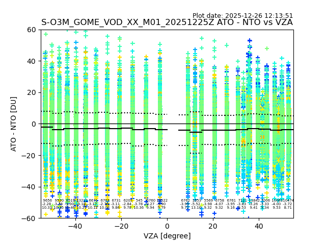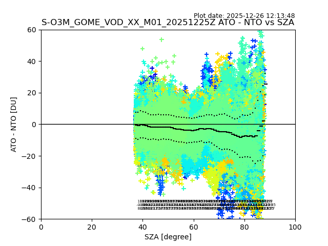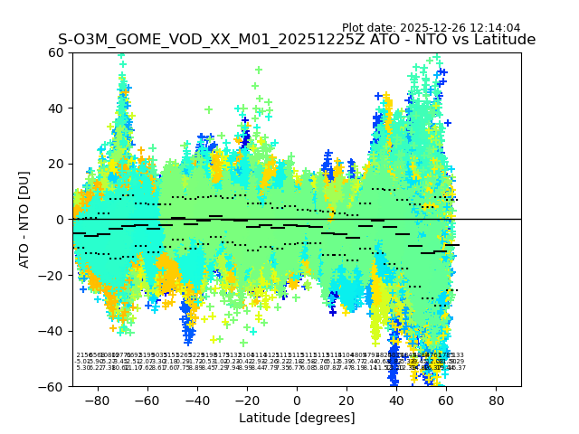 The date given in the title of the plot indicates the T=0 day for which the NTO/O3 data is compared. Example: S-O3M_GOME_VOD__M02_20110117Z indicates that the plot is for data from 2011-01-17 00:00 up NTO/O3 files starting at 2011-01-17 23:59 is used.