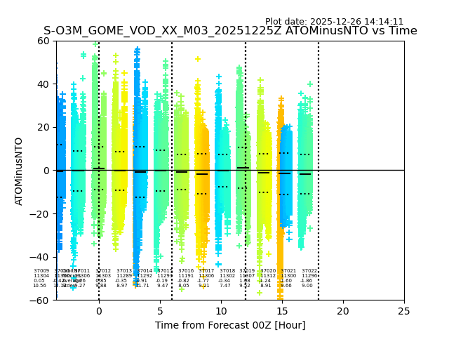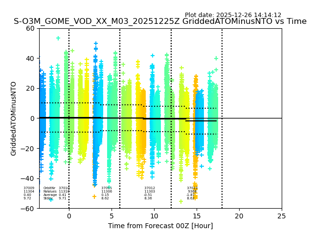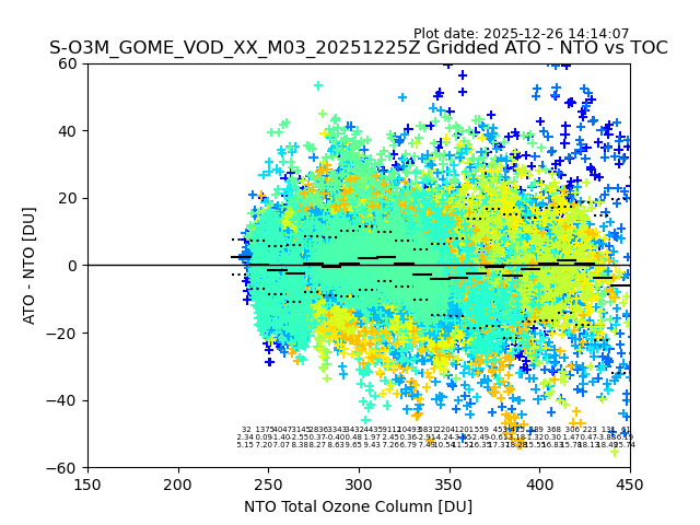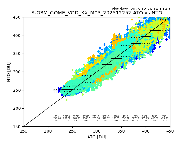 Using these forecast fields, the actual measured NTO/O3 from T=0 to T+24h can be compared. The comparison can be between each individual NTO/O3 retrieval and the ATO value in the associated grid box, or between 'pre-gridded' NTO/O3 values and the ATO value. Both these comparisons are given.