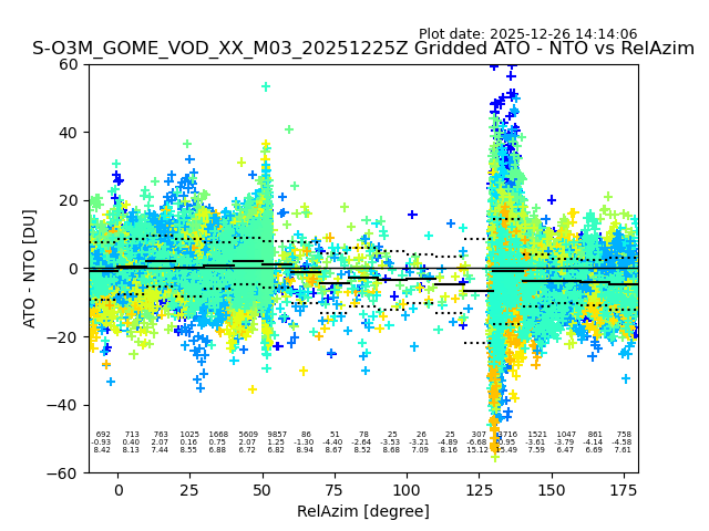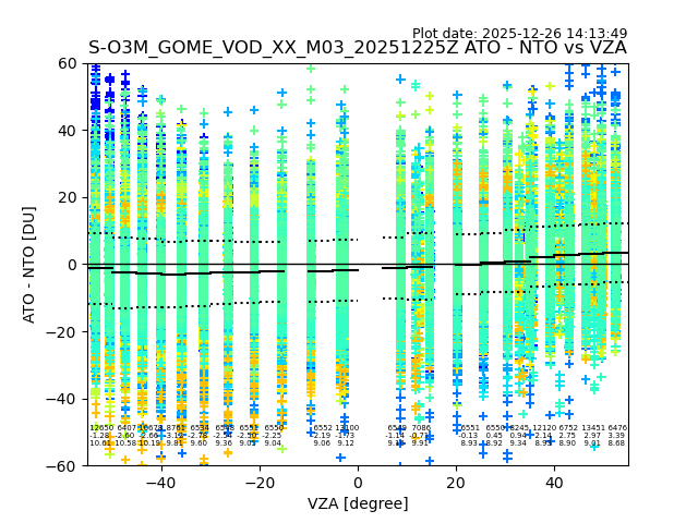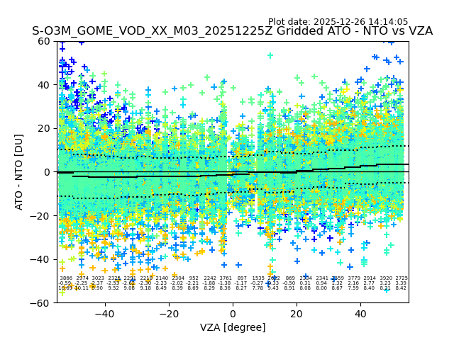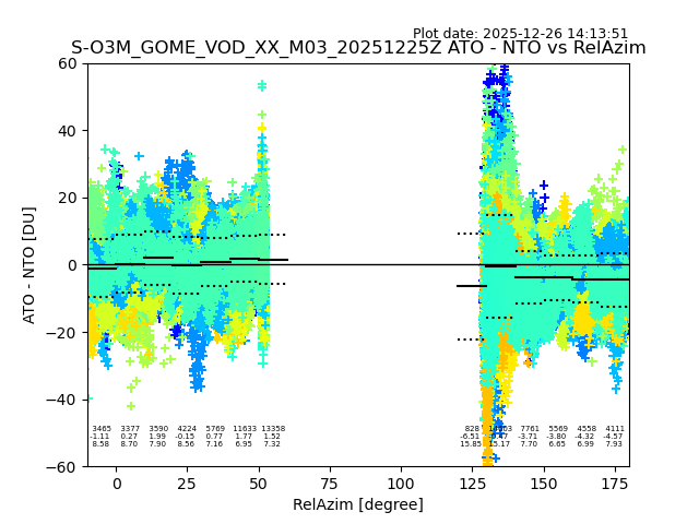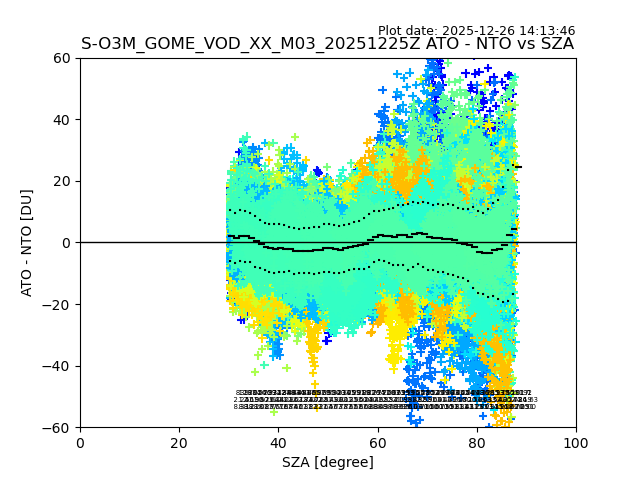 The date given in the title of the plot indicates the T=0 day for which the NTO/O3 data is compared. Example: S-O3M_GOME_VOD__M02_20110117Z indicates that the plot is for data from 2011-01-17 00:00 up NTO/O3 files starting at 2011-01-17 23:59 is used.