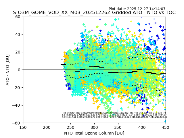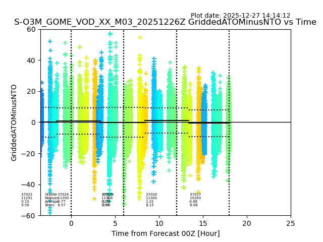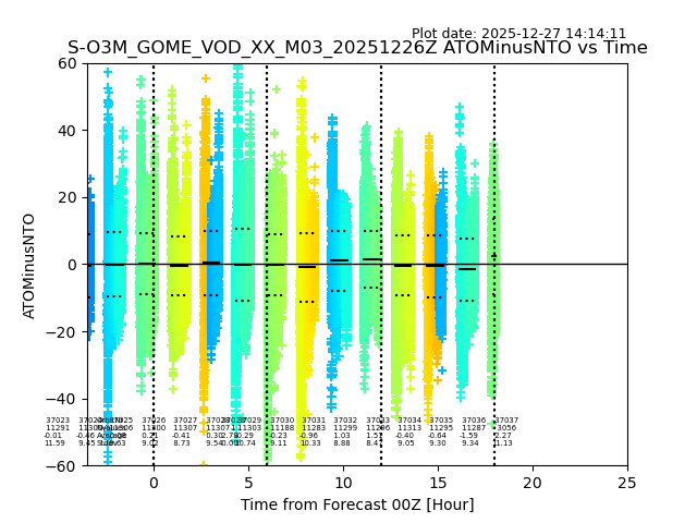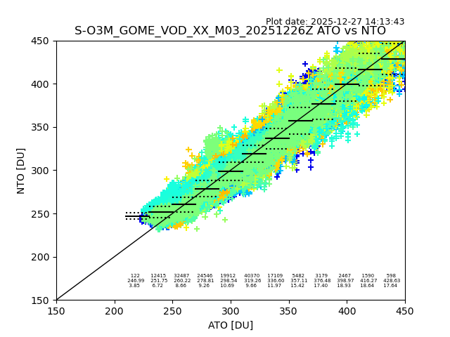 Using these forecast fields, the actual measured NTO/O3 from T=0 to T+24h can be compared. The comparison can be between each individual NTO/O3 retrieval and the ATO value in the associated grid box, or between 'pre-gridded' NTO/O3 values and the ATO value. Both these comparisons are given.