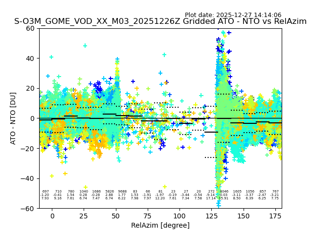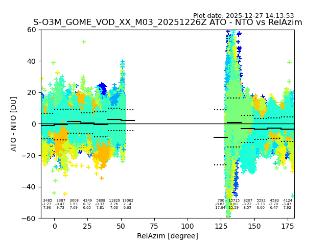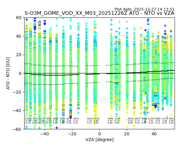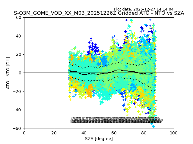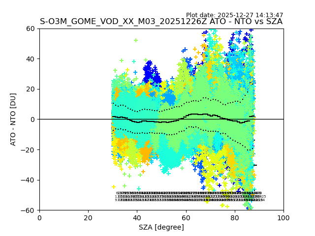 The date given in the title of the plot indicates the T=0 day for which the NTO/O3 data is compared. Example: S-O3M_GOME_VOD__M02_20110117Z indicates that the plot is for data from 2011-01-17 00:00 up NTO/O3 files starting at 2011-01-17 23:59 is used.