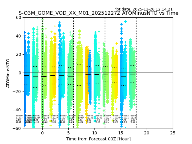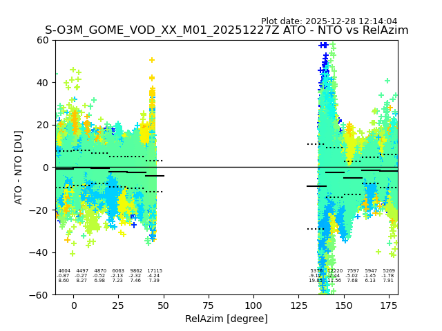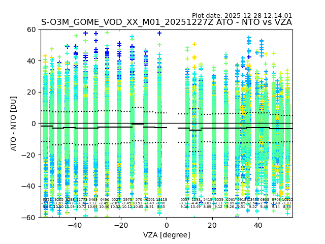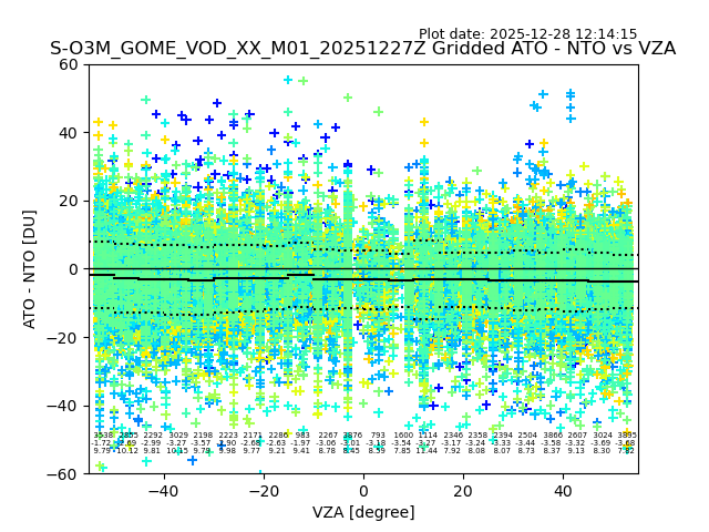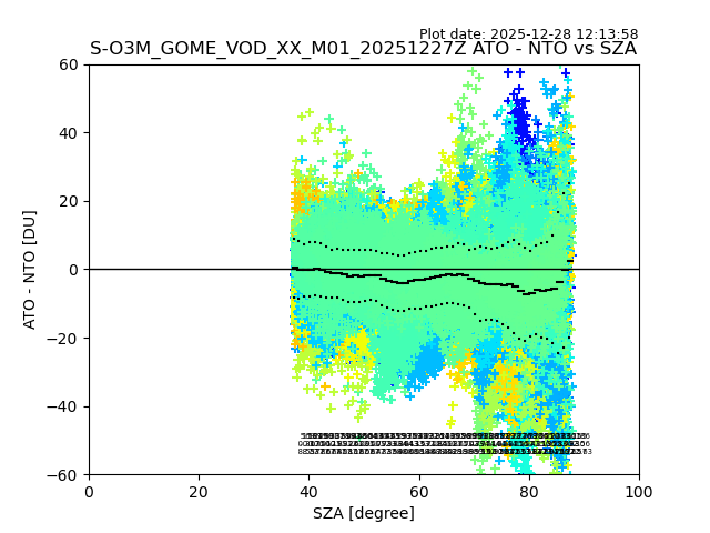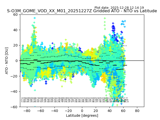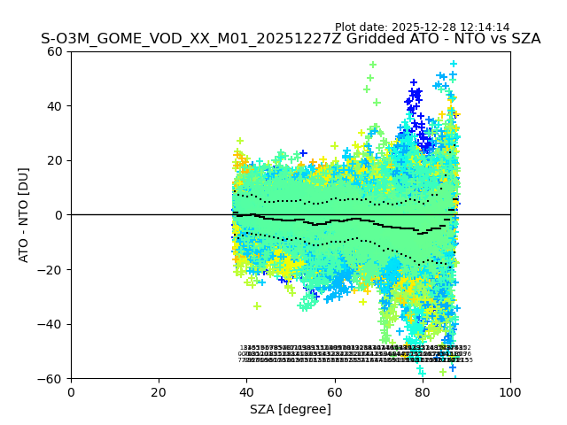 The date given in the title of the plot indicates the T=0 day for which the NTO/O3 data is compared. Example: S-O3M_GOME_VOD__M02_20110117Z indicates that the plot is for data from 2011-01-17 00:00 up NTO/O3 files starting at 2011-01-17 23:59 is used.