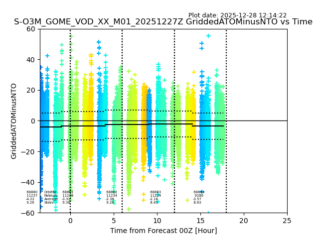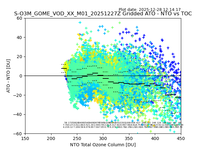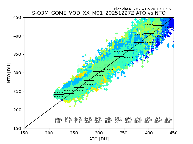 Using these forecast fields, the actual measured NTO/O3 from T=0 to T+24h can be compared. The comparison can be between each individual NTO/O3 retrieval and the ATO value in the associated grid box, or between 'pre-gridded' NTO/O3 values and the ATO value. Both these comparisons are given.