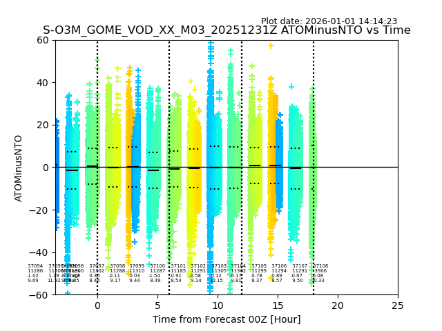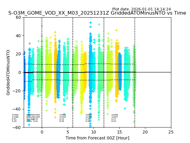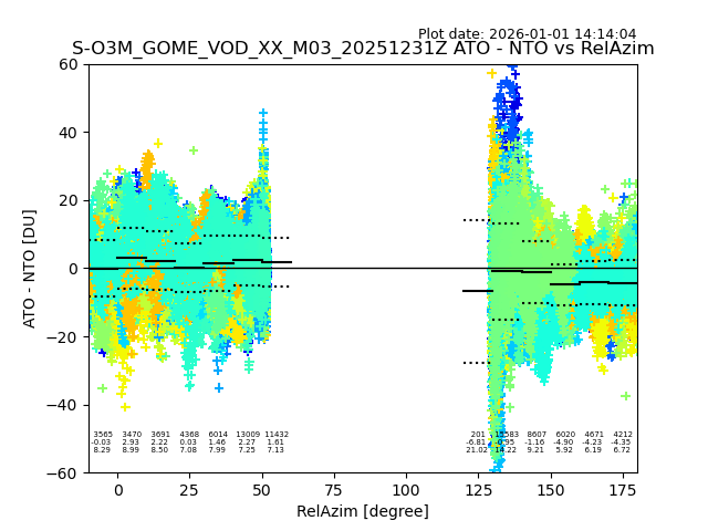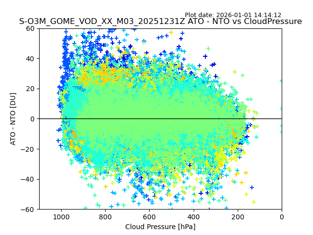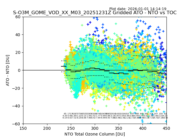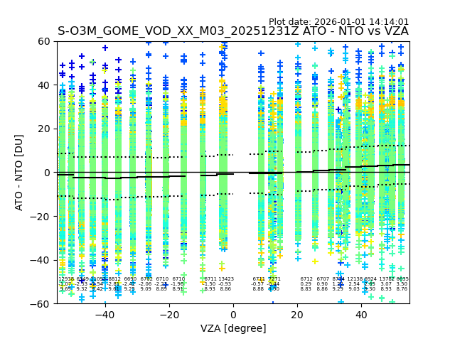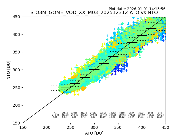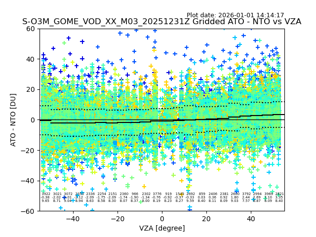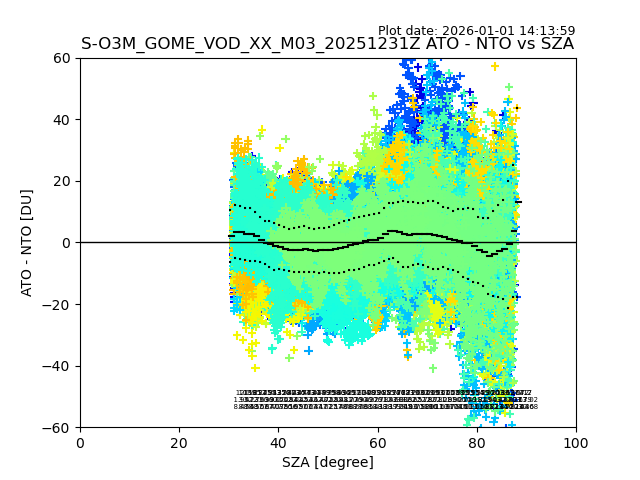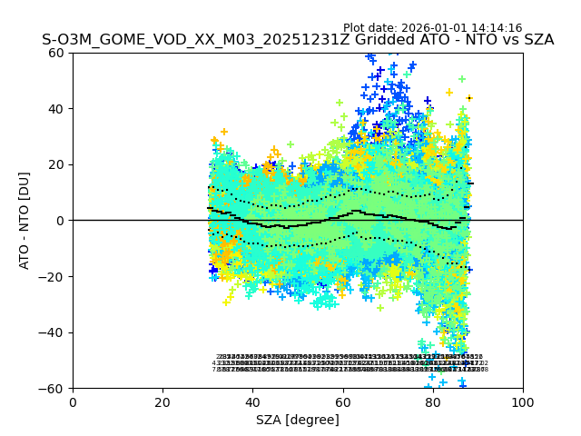 The date given in the title of the plot indicates the T=0 day for which the NTO/O3 data is compared. Example: S-O3M_GOME_VOD__M02_20110117Z indicates that the plot is for data from 2011-01-17 00:00 up NTO/O3 files starting at 2011-01-17 23:59 is used.