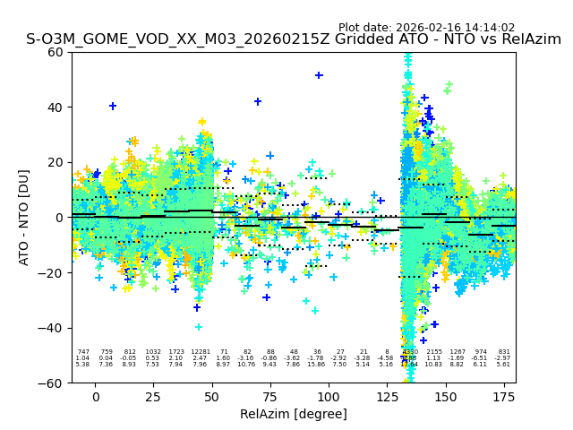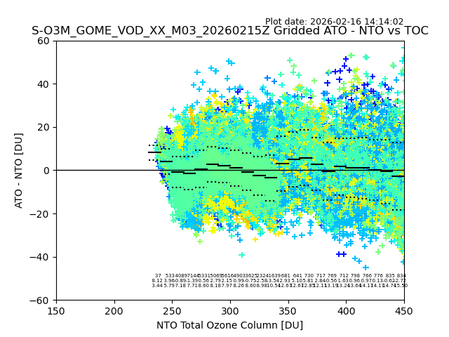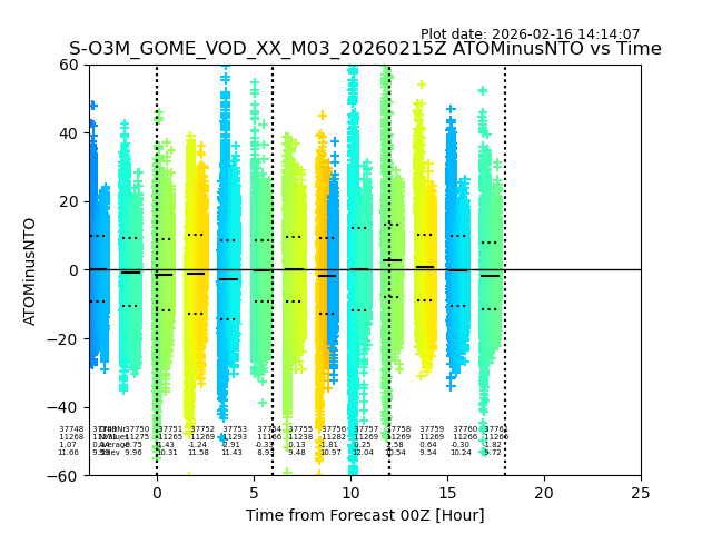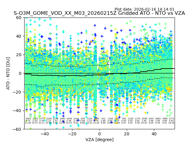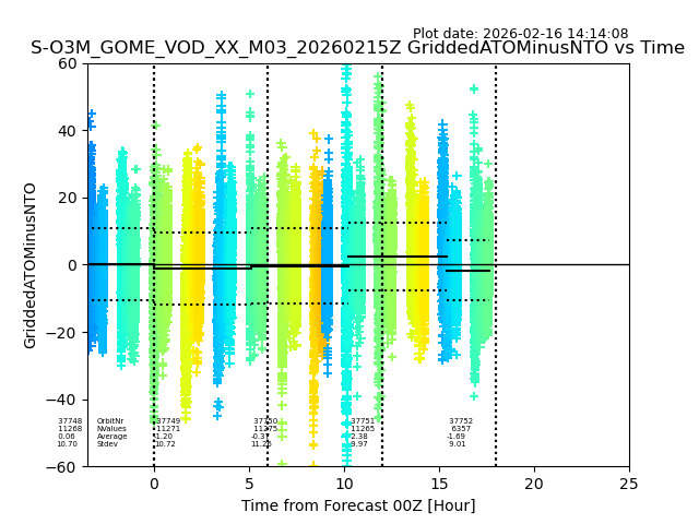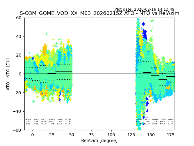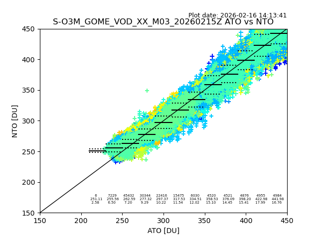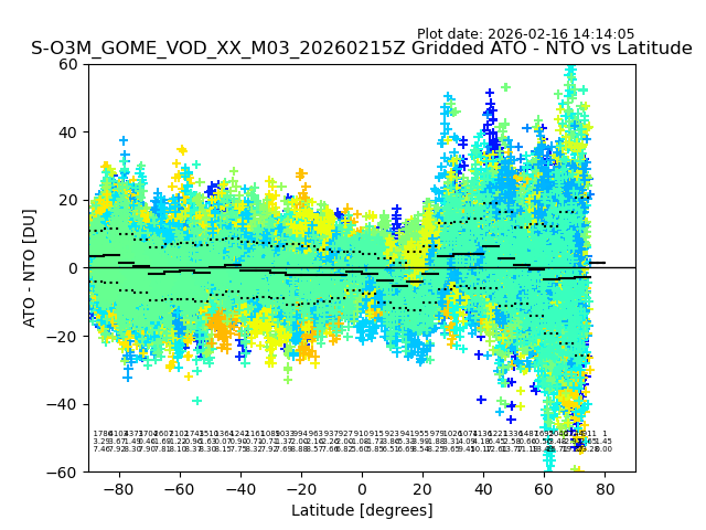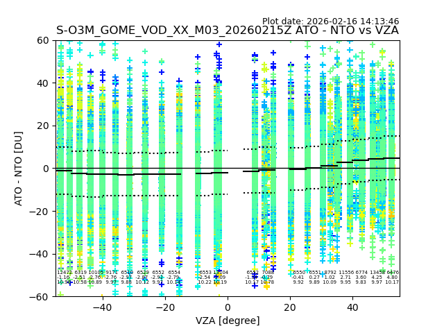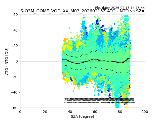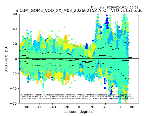 The date given in the title of the plot indicates the T=0 day for which the NTO/O3 data is compared. Example: S-O3M_GOME_VOD__M02_20110117Z indicates that the plot is for data from 2011-01-17 00:00 up NTO/O3 files starting at 2011-01-17 23:59 is used.