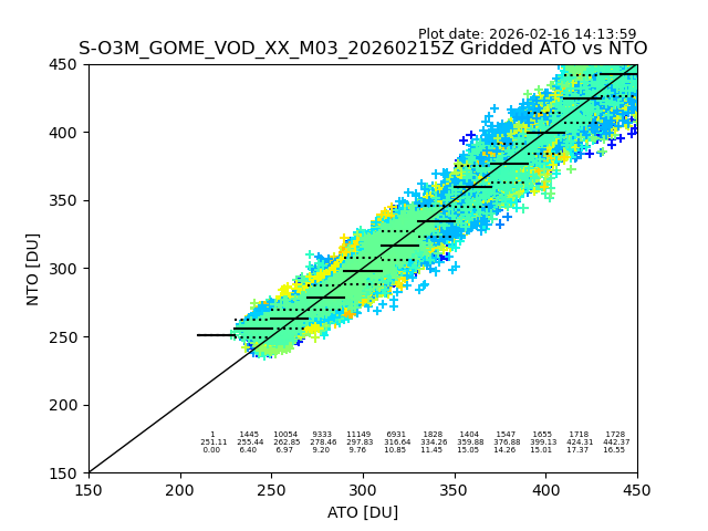 Using these forecast fields, the actual measured NTO/O3 from T=0 to T+24h can be compared. The comparison can be between each individual NTO/O3 retrieval and the ATO value in the associated grid box, or between 'pre-gridded' NTO/O3 values and the ATO value. Both these comparisons are given.