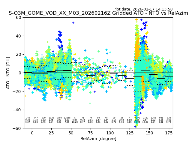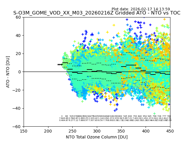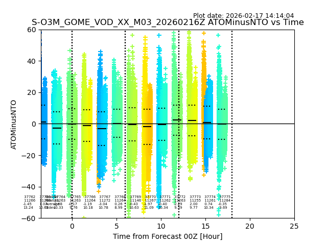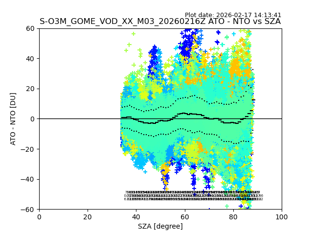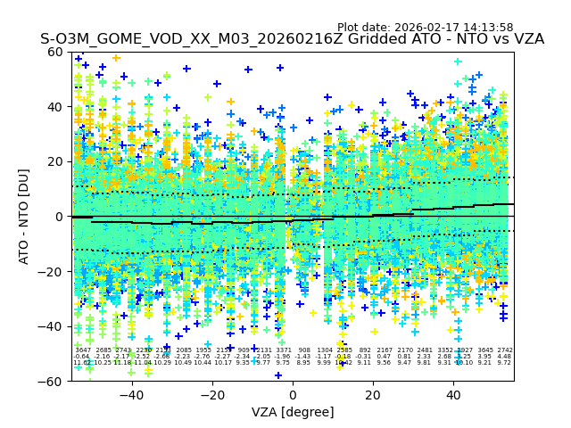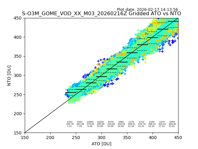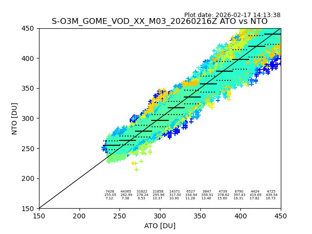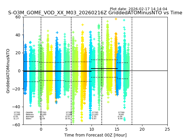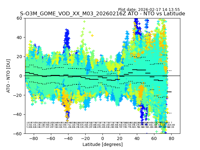 The date given in the title of the plot indicates the T=0 day for which the NTO/O3 data is compared. Example: S-O3M_GOME_VOD__M02_20110117Z indicates that the plot is for data from 2011-01-17 00:00 up NTO/O3 files starting at 2011-01-17 23:59 is used.