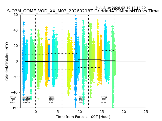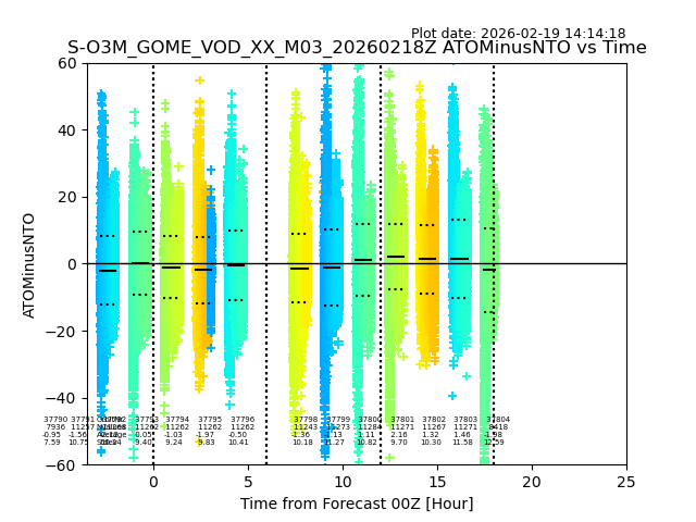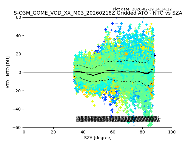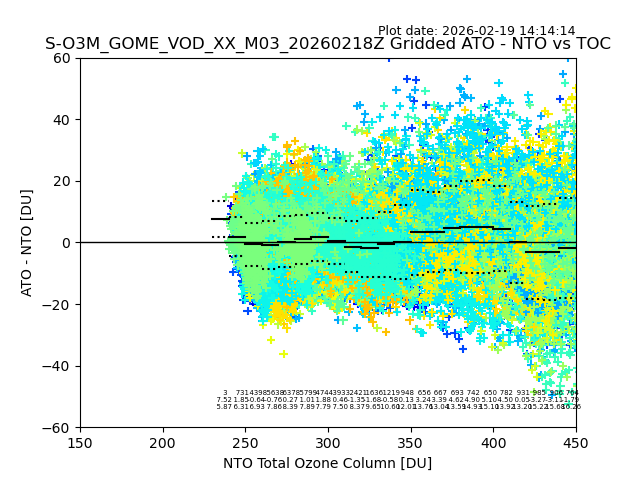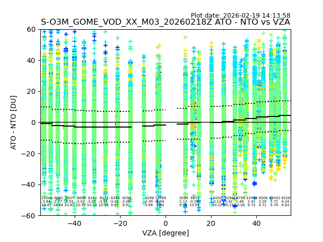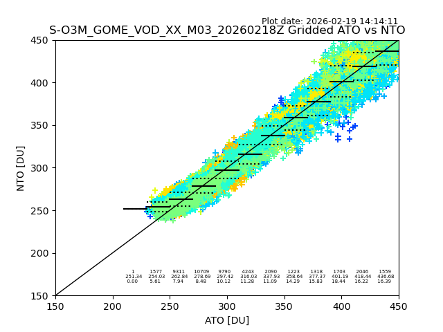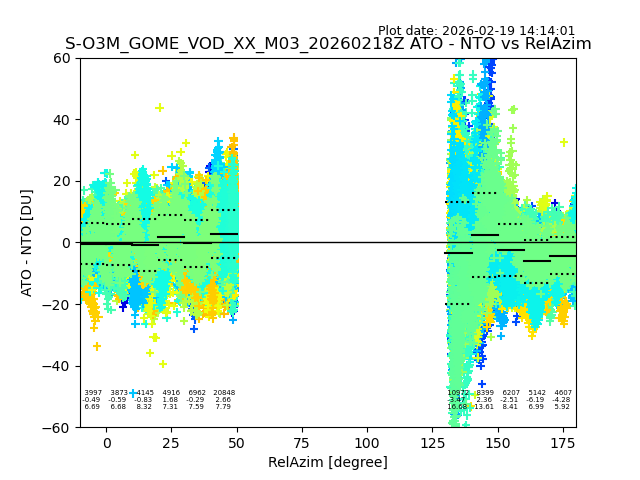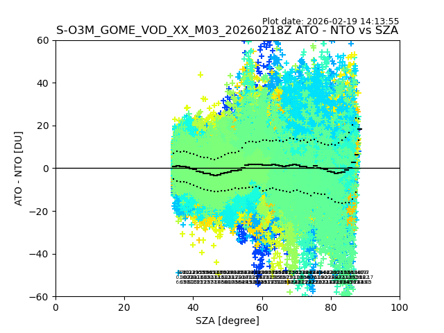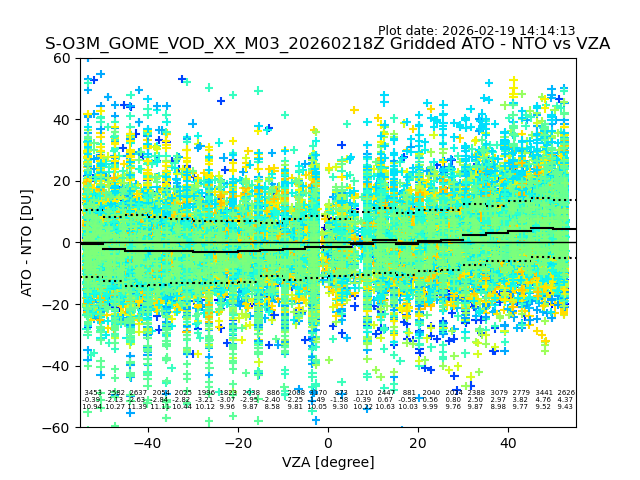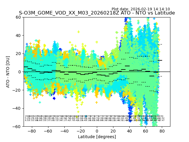 The date given in the title of the plot indicates the T=0 day for which the NTO/O3 data is compared. Example: S-O3M_GOME_VOD__M02_20110117Z indicates that the plot is for data from 2011-01-17 00:00 up NTO/O3 files starting at 2011-01-17 23:59 is used.