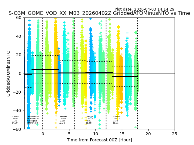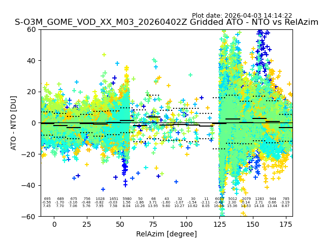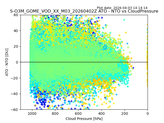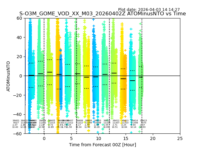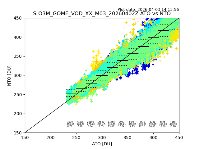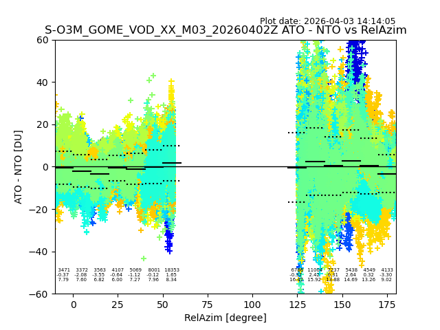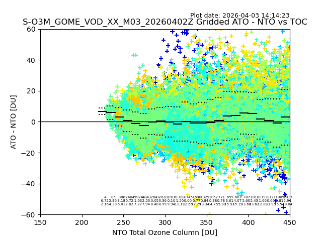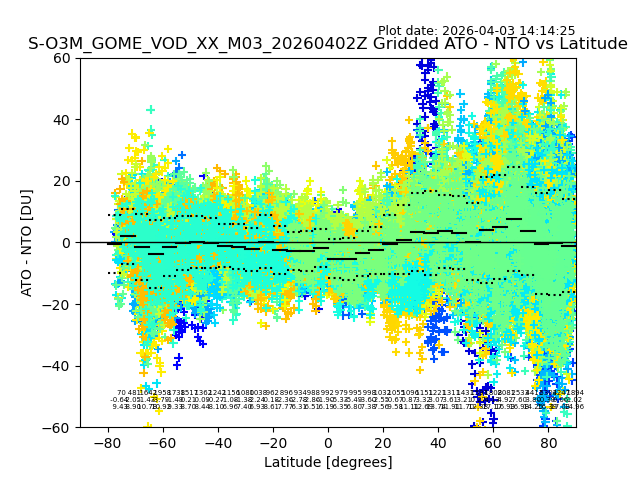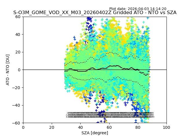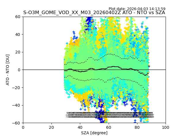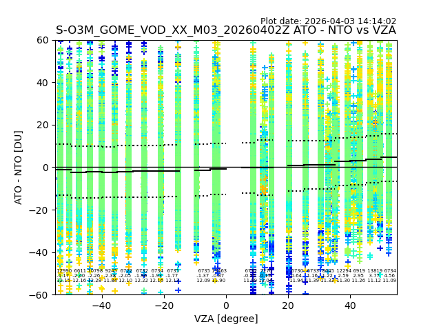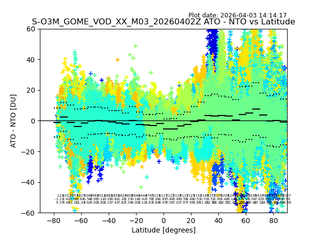 The date given in the title of the plot indicates the T=0 day for which the NTO/O3 data is compared. Example: S-O3M_GOME_VOD__M02_20110117Z indicates that the plot is for data from 2011-01-17 00:00 up NTO/O3 files starting at 2011-01-17 23:59 is used.