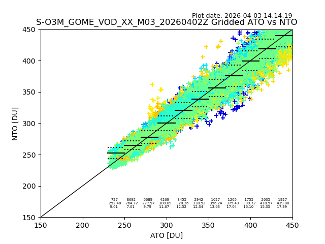 Using these forecast fields, the actual measured NTO/O3 from T=0 to T+24h can be compared. The comparison can be between each individual NTO/O3 retrieval and the ATO value in the associated grid box, or between 'pre-gridded' NTO/O3 values and the ATO value. Both these comparisons are given.
