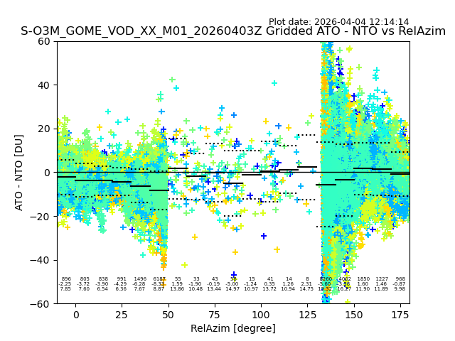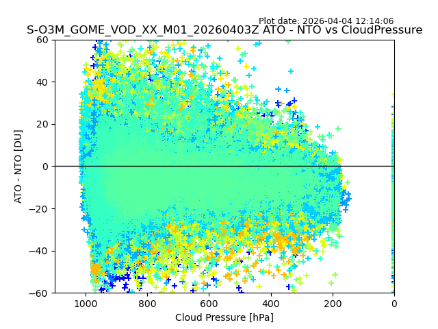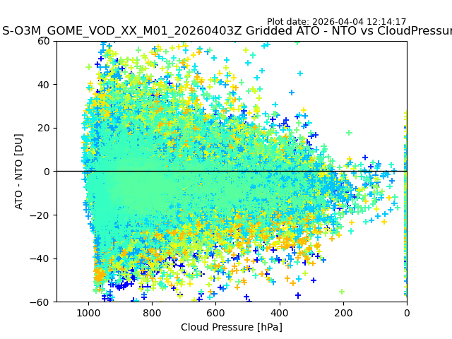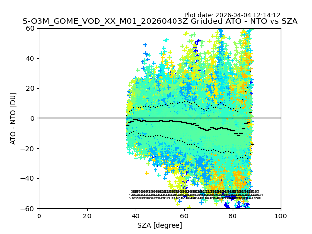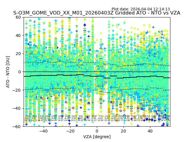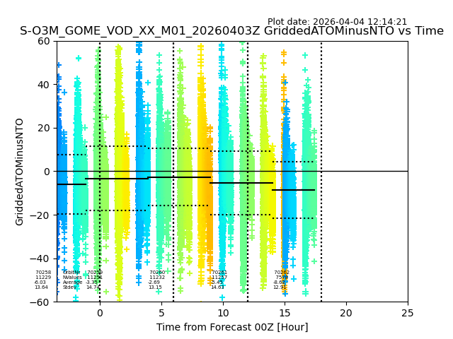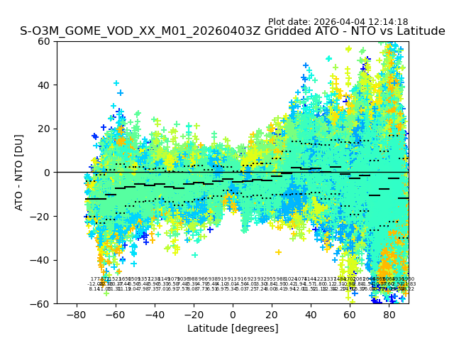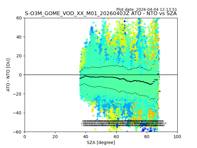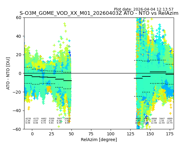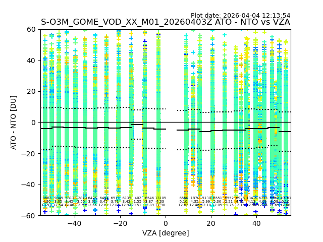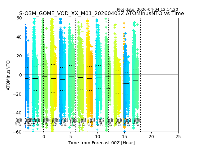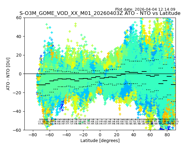 The date given in the title of the plot indicates the T=0 day for which the NTO/O3 data is compared. Example: S-O3M_GOME_VOD__M02_20110117Z indicates that the plot is for data from 2011-01-17 00:00 up NTO/O3 files starting at 2011-01-17 23:59 is used.