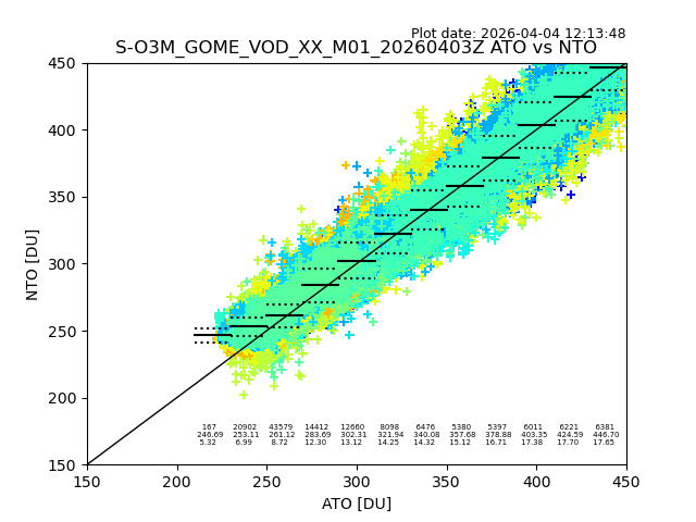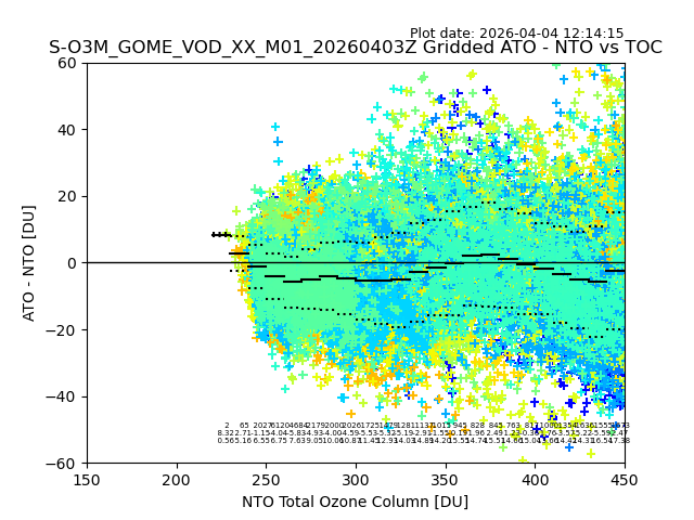 Using these forecast fields, the actual measured NTO/O3 from T=0 to T+24h can be compared. The comparison can be between each individual NTO/O3 retrieval and the ATO value in the associated grid box, or between 'pre-gridded' NTO/O3 values and the ATO value. Both these comparisons are given.