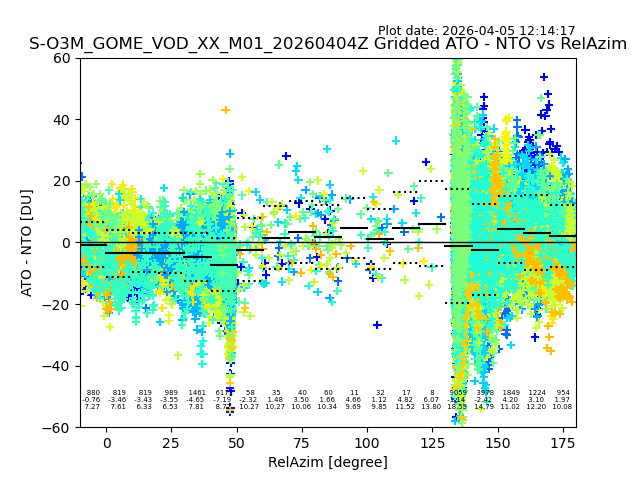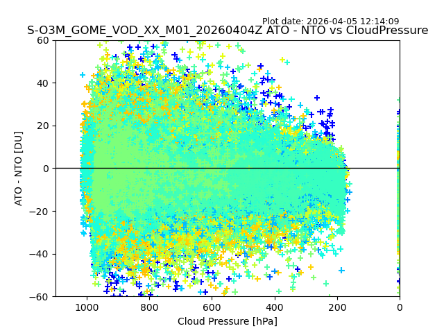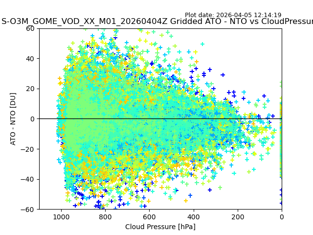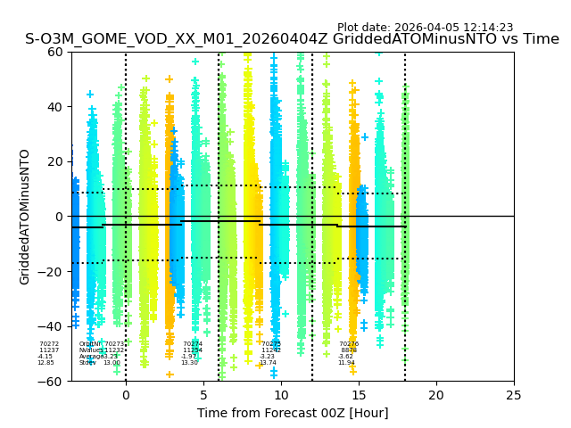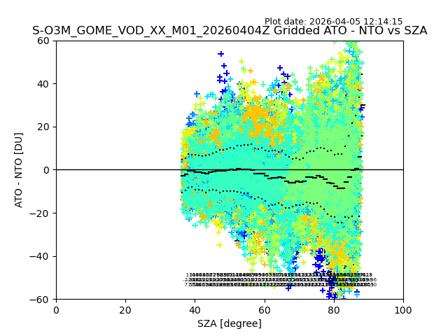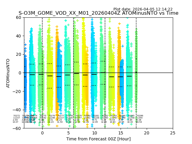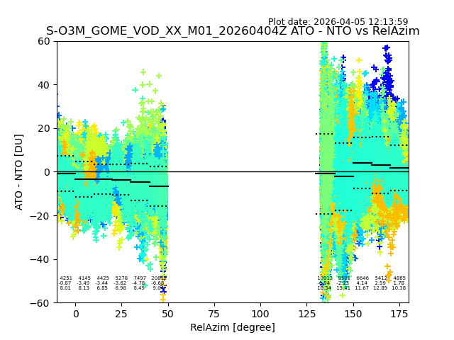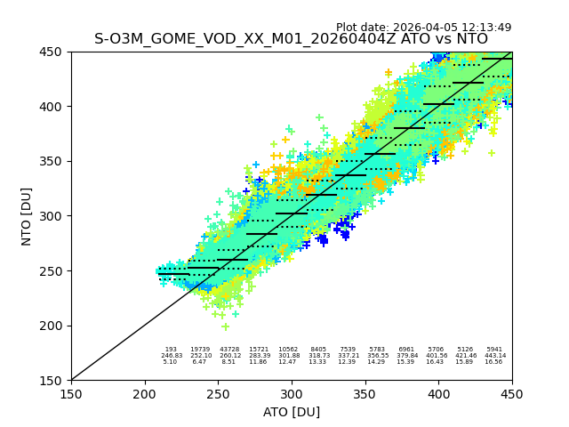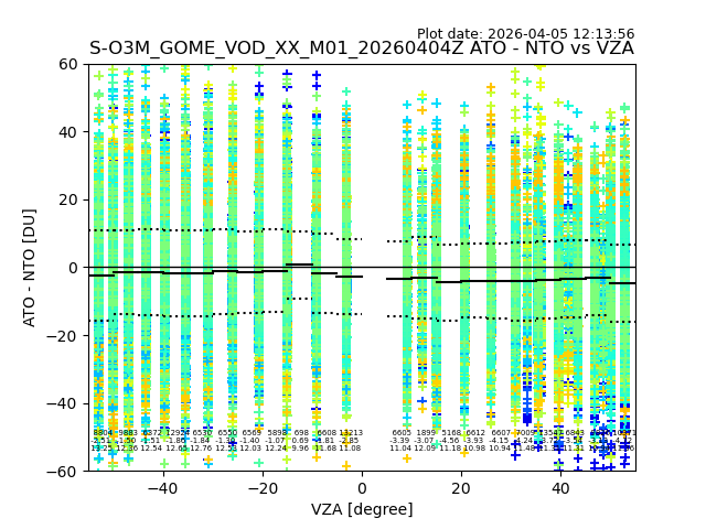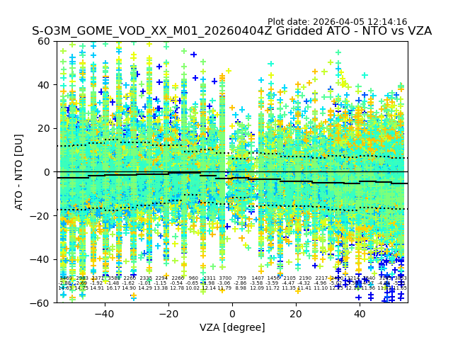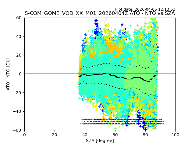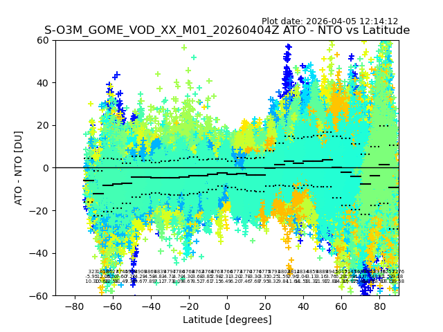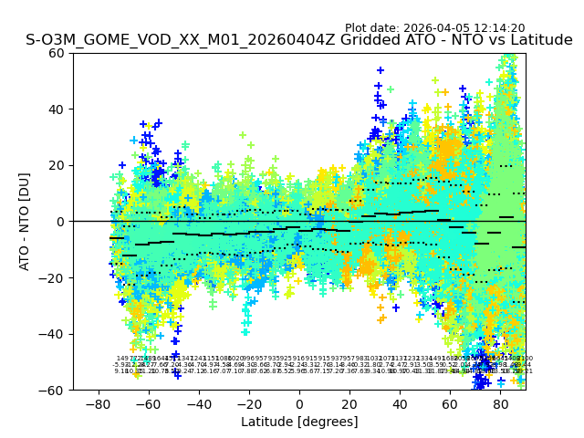 The date given in the title of the plot indicates the T=0 day for which the NTO/O3 data is compared. Example: S-O3M_GOME_VOD__M02_20110117Z indicates that the plot is for data from 2011-01-17 00:00 up NTO/O3 files starting at 2011-01-17 23:59 is used.