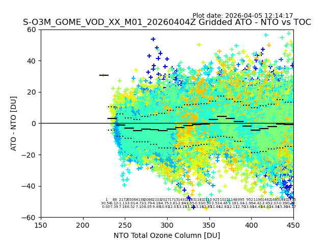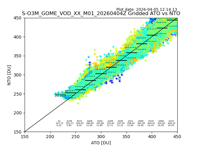 Using these forecast fields, the actual measured NTO/O3 from T=0 to T+24h can be compared. The comparison can be between each individual NTO/O3 retrieval and the ATO value in the associated grid box, or between 'pre-gridded' NTO/O3 values and the ATO value. Both these comparisons are given.