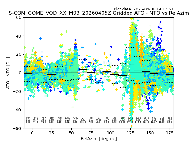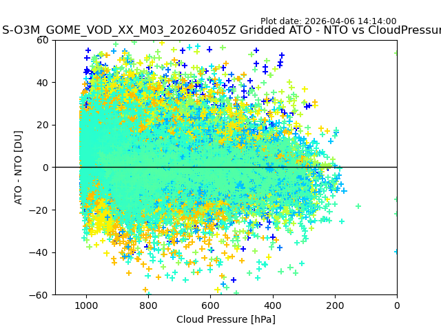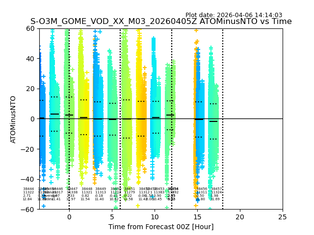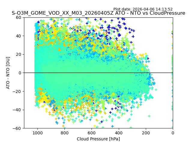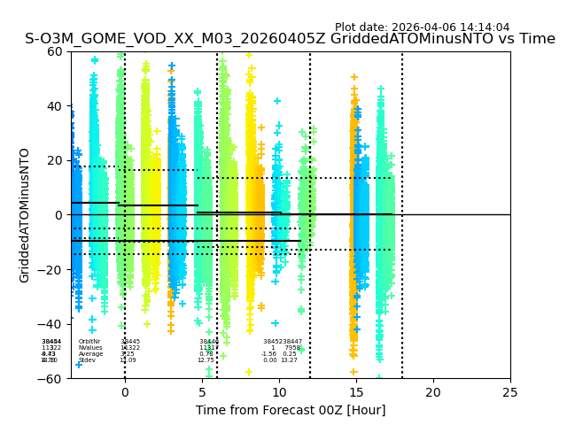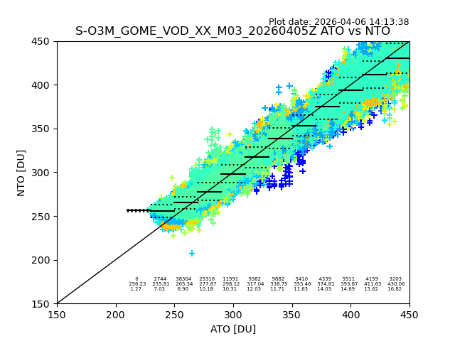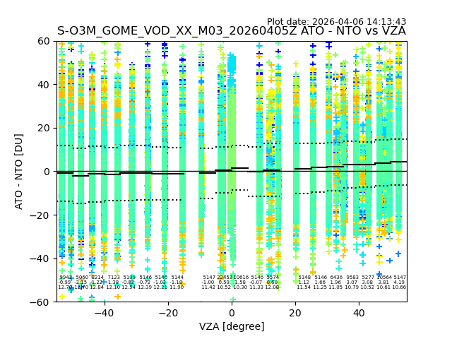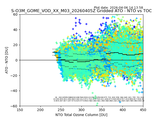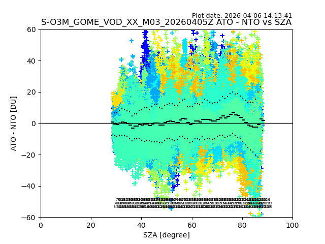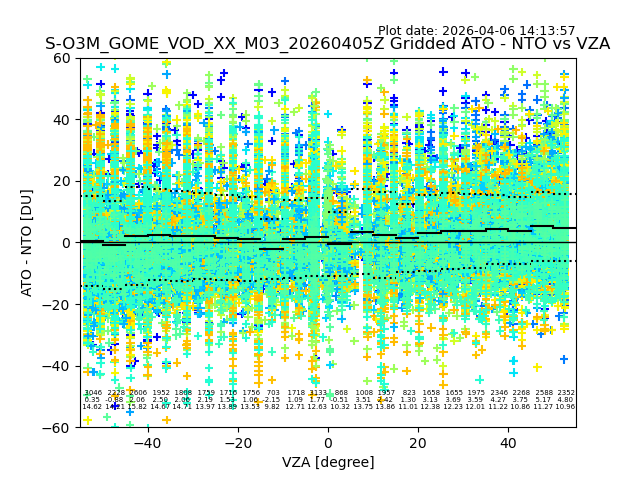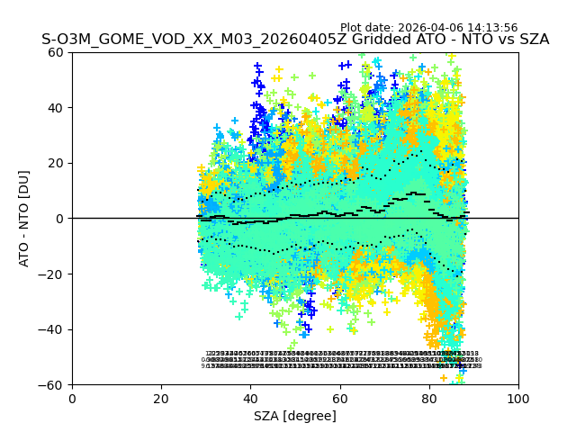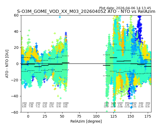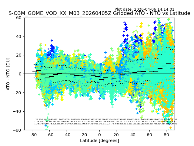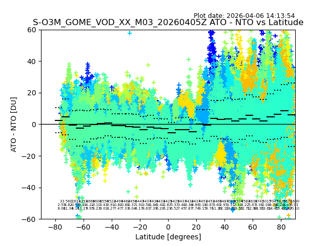 The date given in the title of the plot indicates the T=0 day for which the NTO/O3 data is compared. Example: S-O3M_GOME_VOD__M02_20110117Z indicates that the plot is for data from 2011-01-17 00:00 up NTO/O3 files starting at 2011-01-17 23:59 is used.