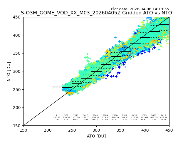 Using these forecast fields, the actual measured NTO/O3 from T=0 to T+24h can be compared. The comparison can be between each individual NTO/O3 retrieval and the ATO value in the associated grid box, or between 'pre-gridded' NTO/O3 values and the ATO value. Both these comparisons are given.