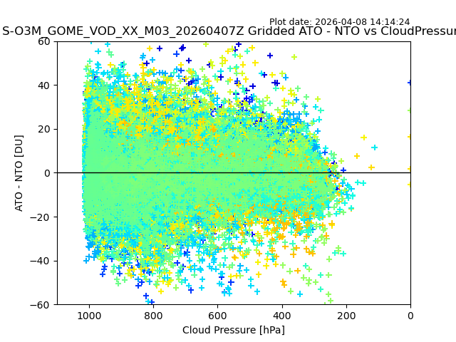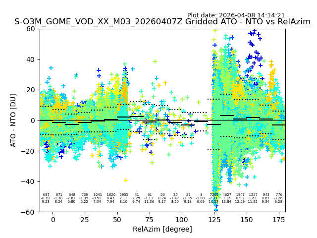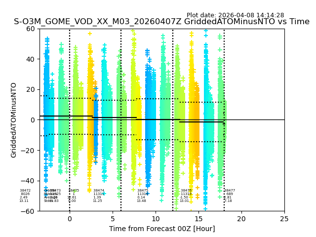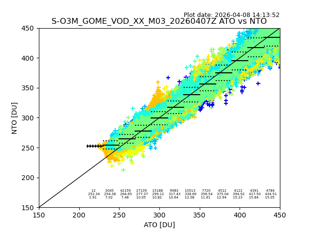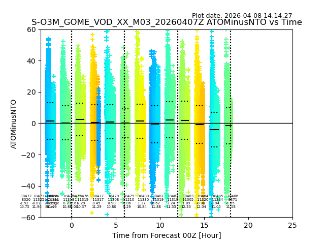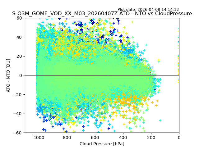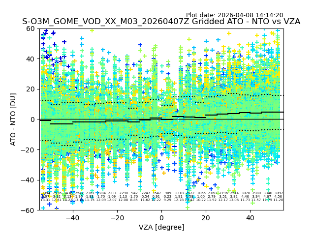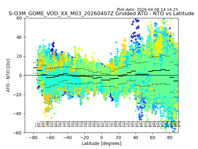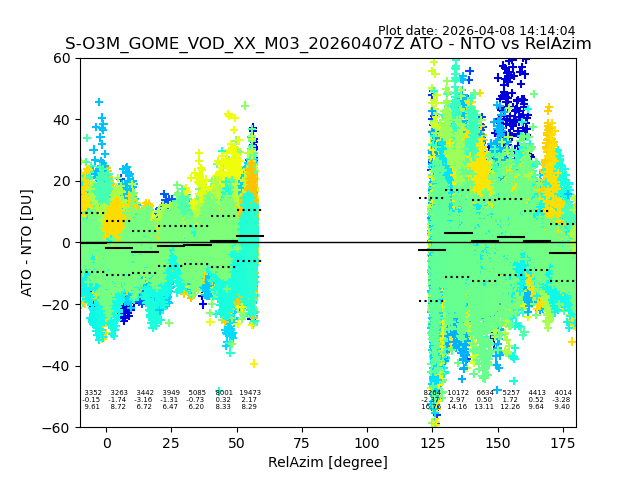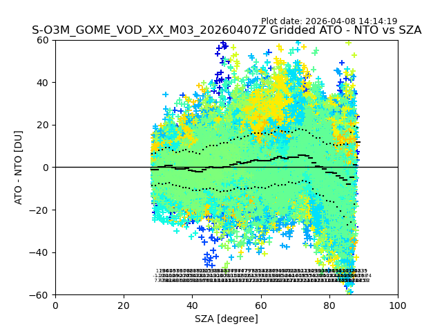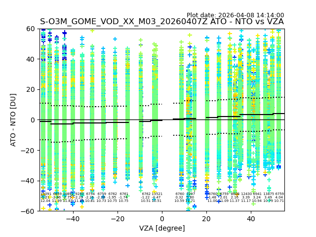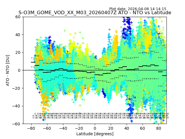 The date given in the title of the plot indicates the T=0 day for which the NTO/O3 data is compared. Example: S-O3M_GOME_VOD__M02_20110117Z indicates that the plot is for data from 2011-01-17 00:00 up NTO/O3 files starting at 2011-01-17 23:59 is used.