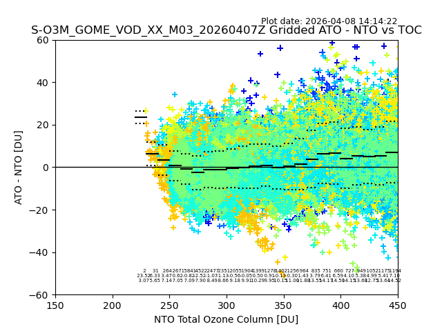 Using these forecast fields, the actual measured NTO/O3 from T=0 to T+24h can be compared. The comparison can be between each individual NTO/O3 retrieval and the ATO value in the associated grid box, or between 'pre-gridded' NTO/O3 values and the ATO value. Both these comparisons are given.