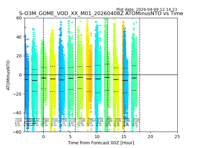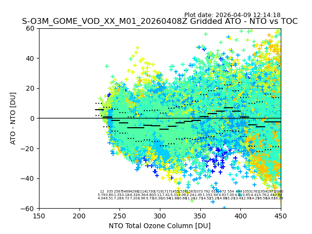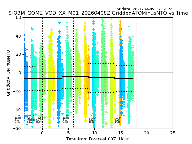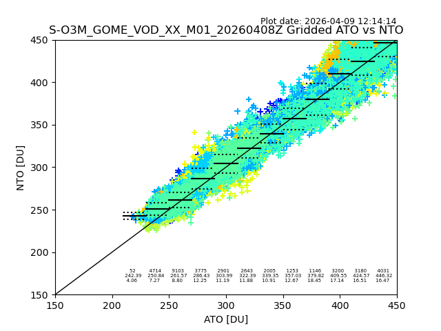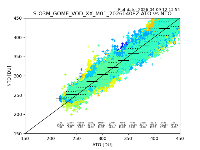 Using these forecast fields, the actual measured NTO/O3 from T=0 to T+24h can be compared. The comparison can be between each individual NTO/O3 retrieval and the ATO value in the associated grid box, or between 'pre-gridded' NTO/O3 values and the ATO value. Both these comparisons are given.