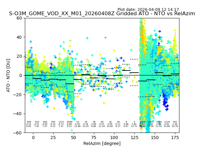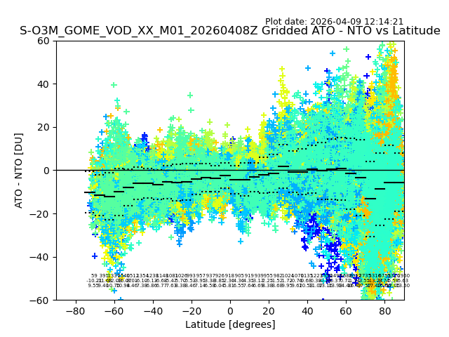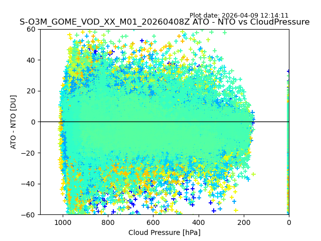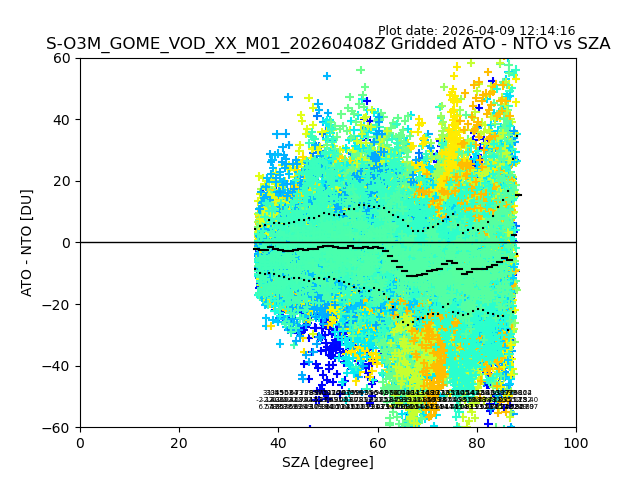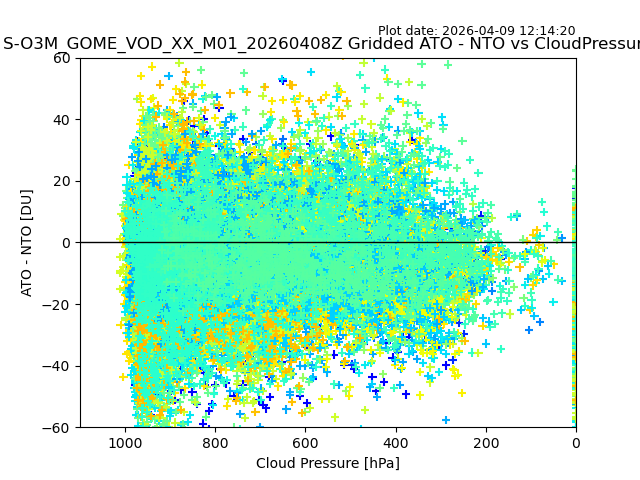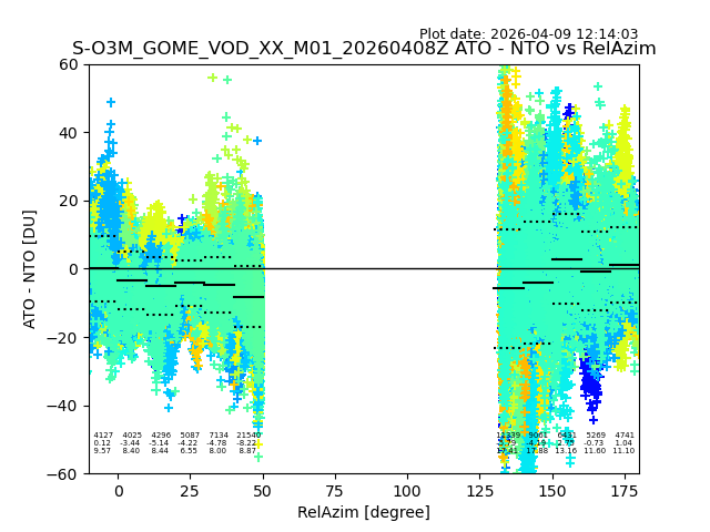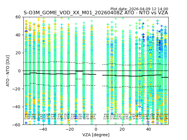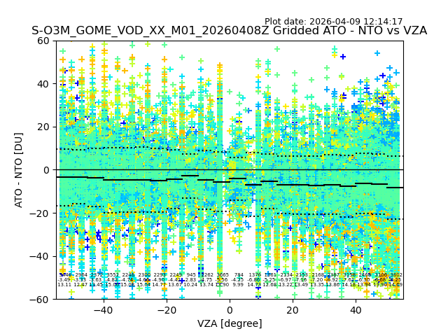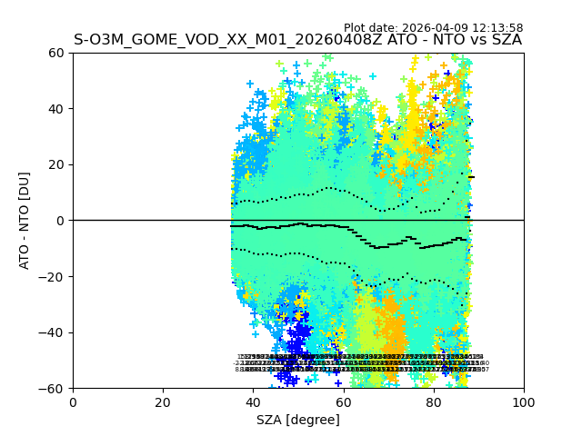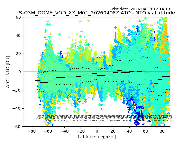 The date given in the title of the plot indicates the T=0 day for which the NTO/O3 data is compared. Example: S-O3M_GOME_VOD__M02_20110117Z indicates that the plot is for data from 2011-01-17 00:00 up NTO/O3 files starting at 2011-01-17 23:59 is used.