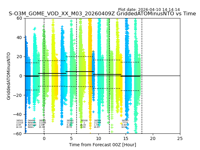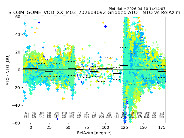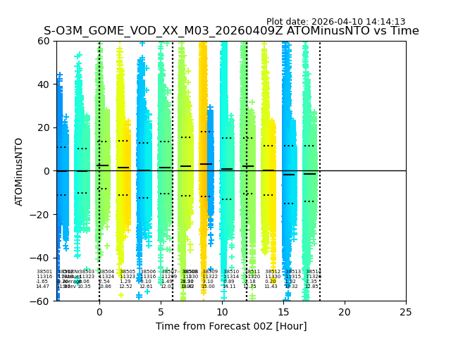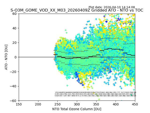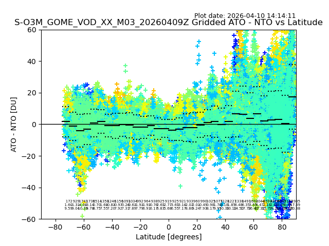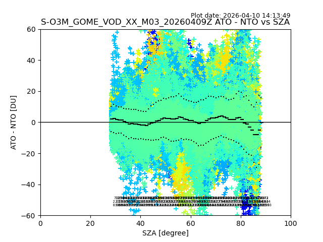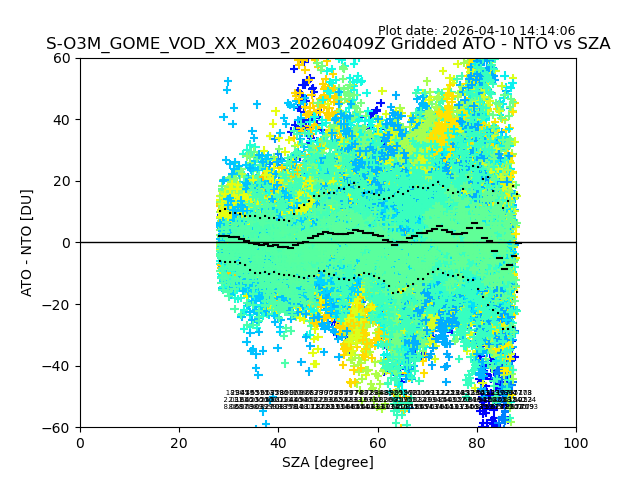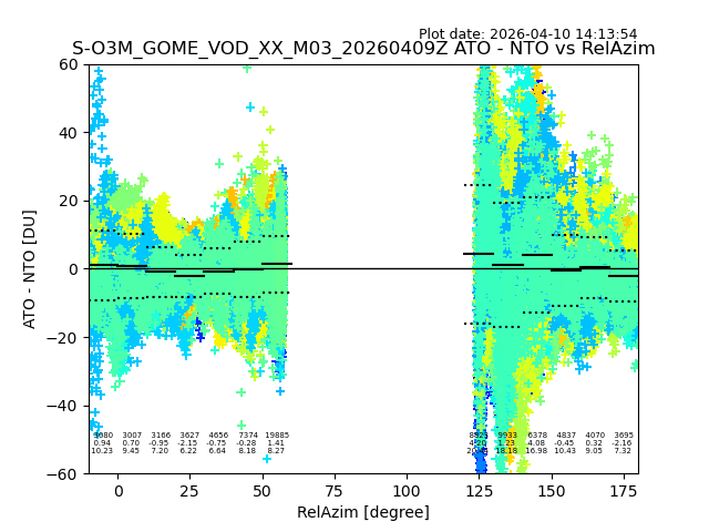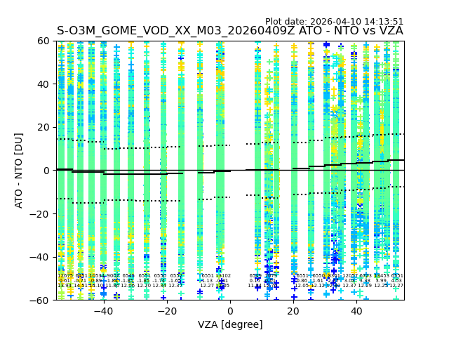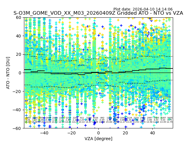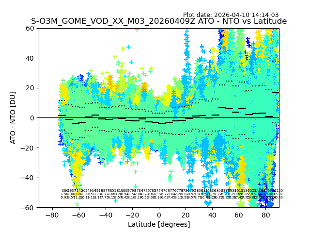 The date given in the title of the plot indicates the T=0 day for which the NTO/O3 data is compared. Example: S-O3M_GOME_VOD__M02_20110117Z indicates that the plot is for data from 2011-01-17 00:00 up NTO/O3 files starting at 2011-01-17 23:59 is used.