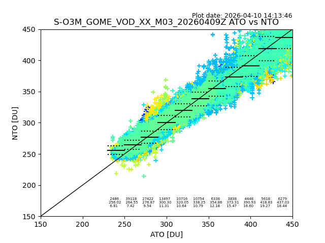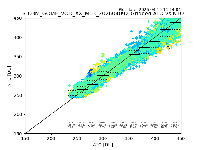 Using these forecast fields, the actual measured NTO/O3 from T=0 to T+24h can be compared. The comparison can be between each individual NTO/O3 retrieval and the ATO value in the associated grid box, or between 'pre-gridded' NTO/O3 values and the ATO value. Both these comparisons are given.