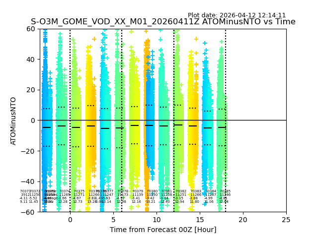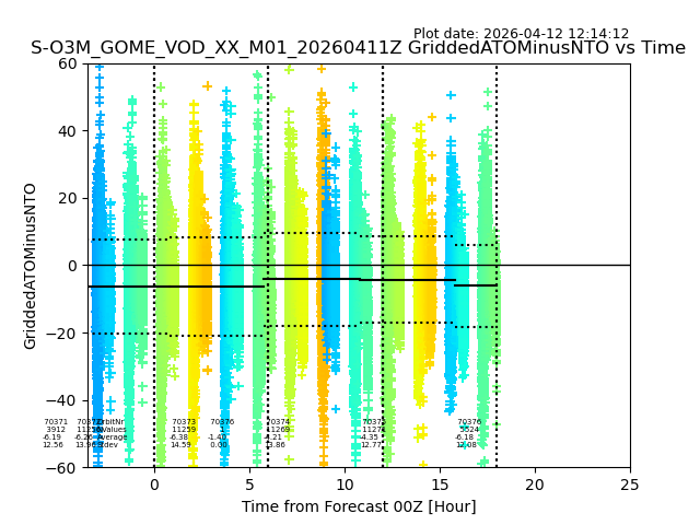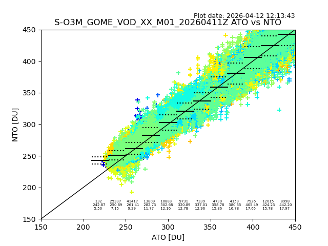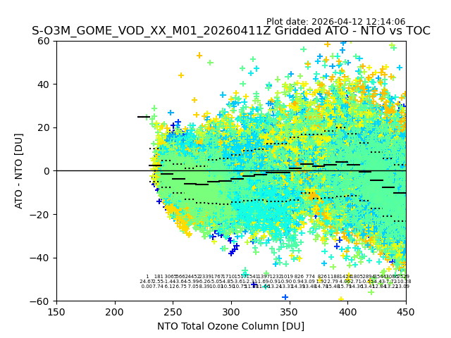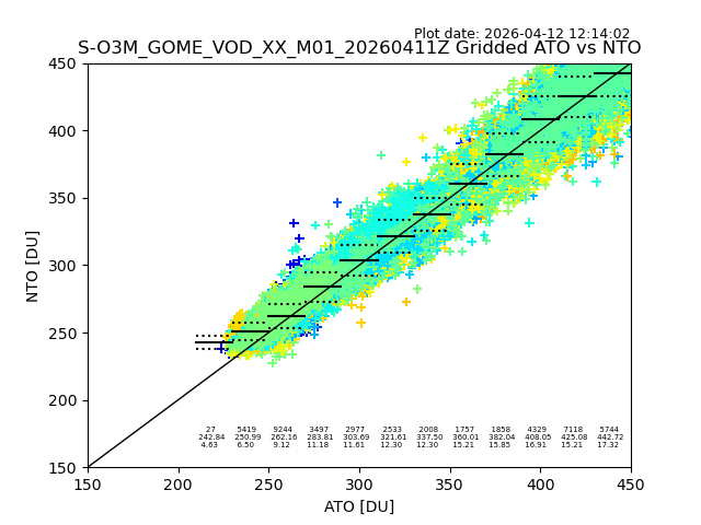 Using these forecast fields, the actual measured NTO/O3 from T=0 to T+24h can be compared. The comparison can be between each individual NTO/O3 retrieval and the ATO value in the associated grid box, or between 'pre-gridded' NTO/O3 values and the ATO value. Both these comparisons are given.