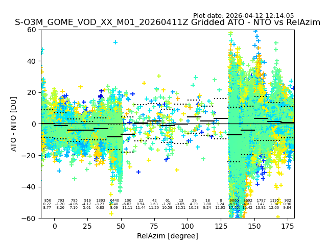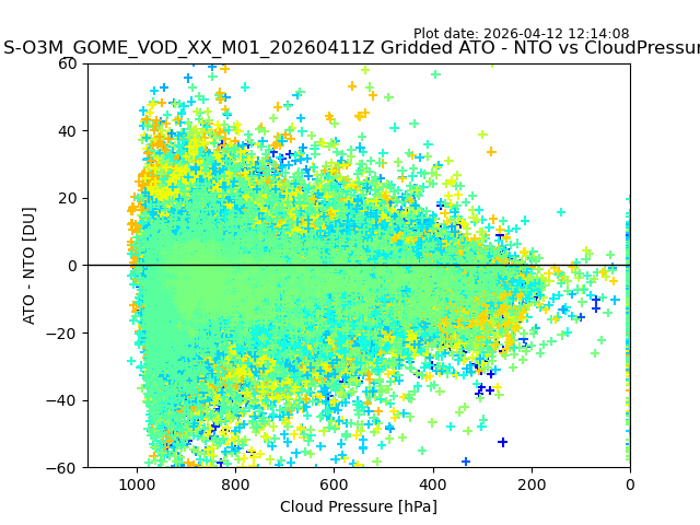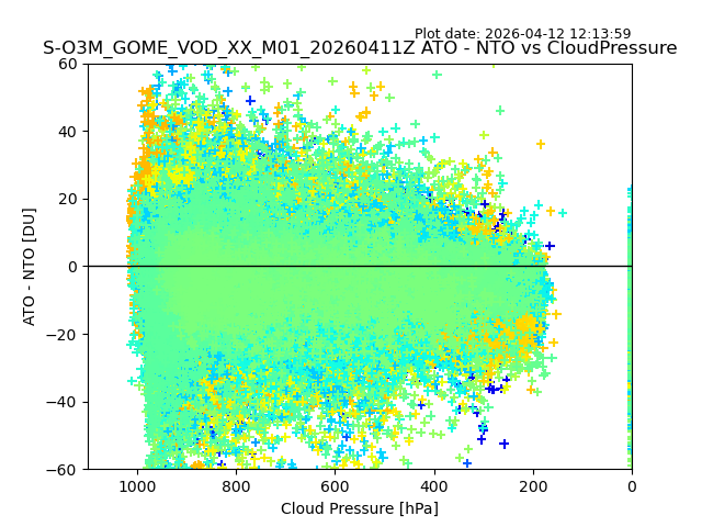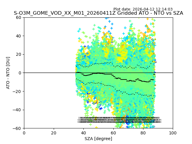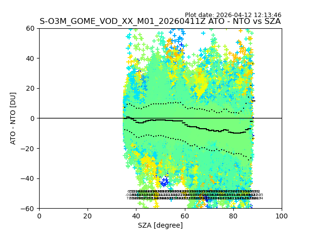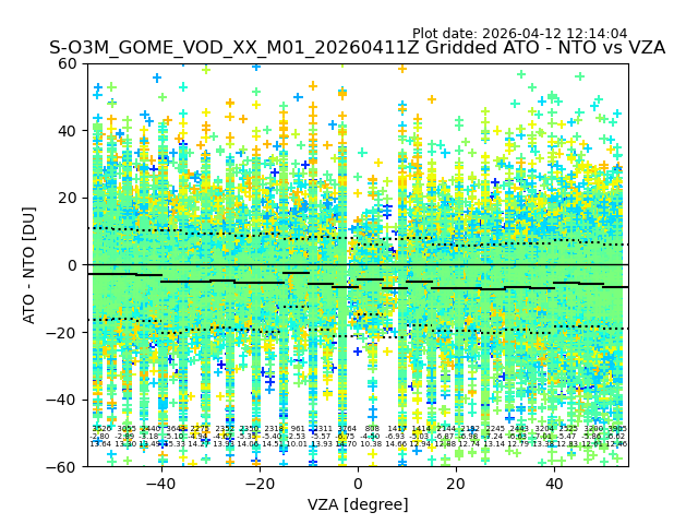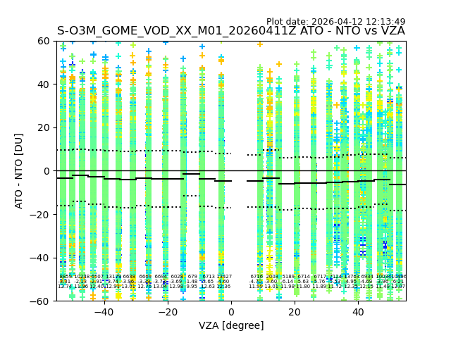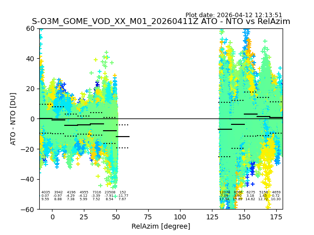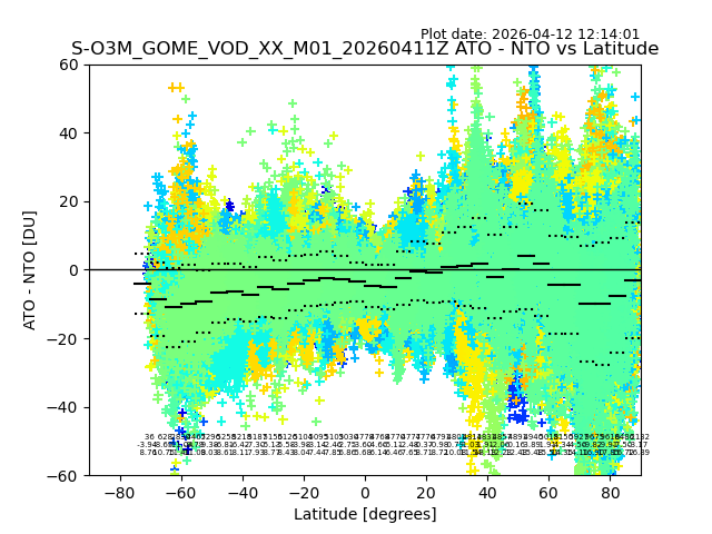 The date given in the title of the plot indicates the T=0 day for which the NTO/O3 data is compared. Example: S-O3M_GOME_VOD__M02_20110117Z indicates that the plot is for data from 2011-01-17 00:00 up NTO/O3 files starting at 2011-01-17 23:59 is used.