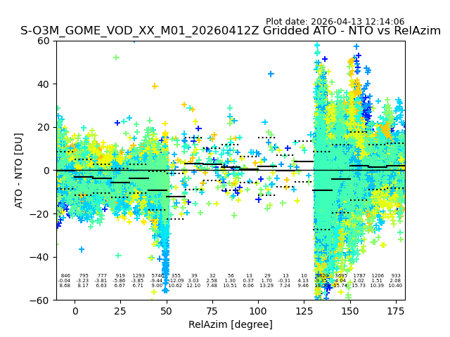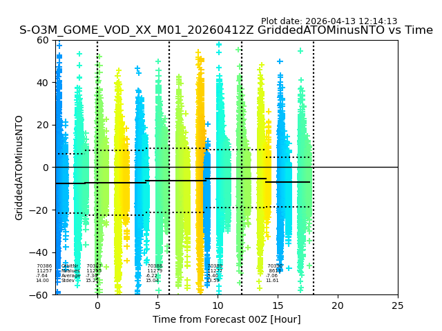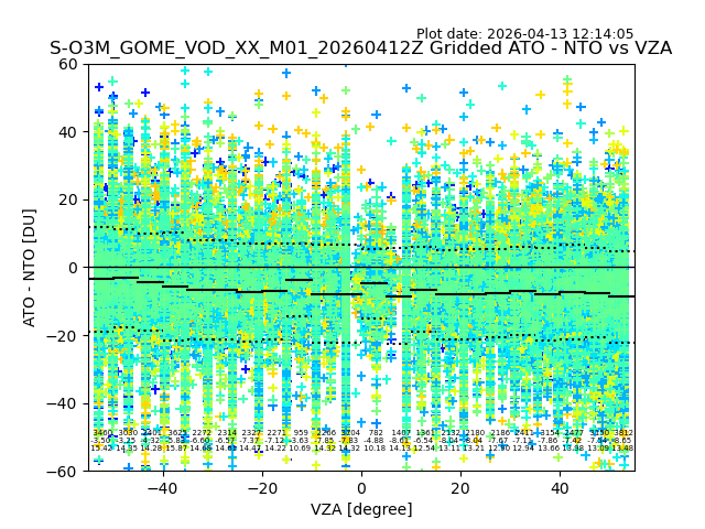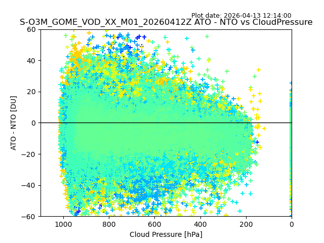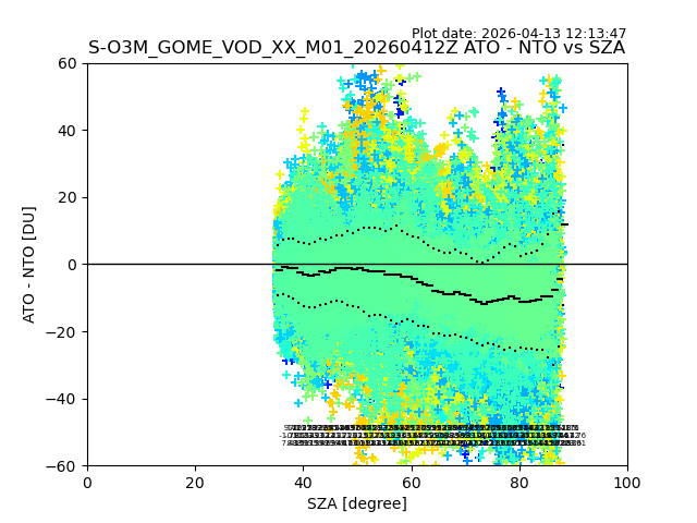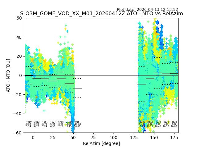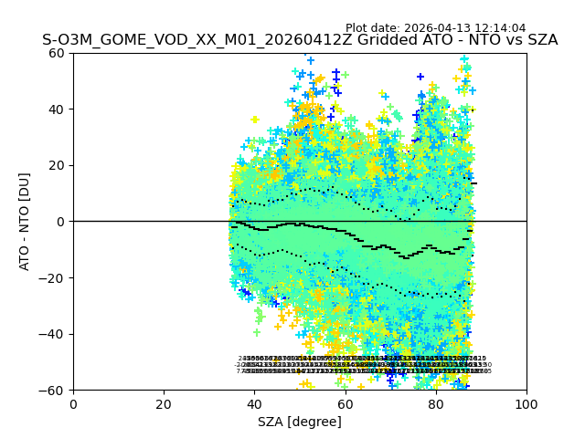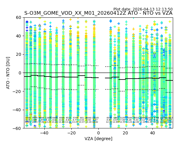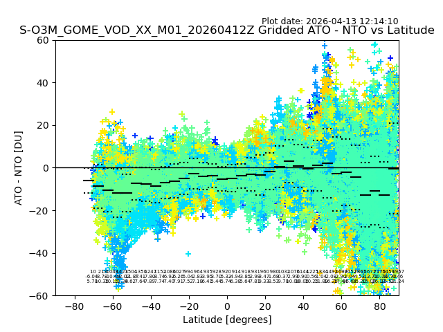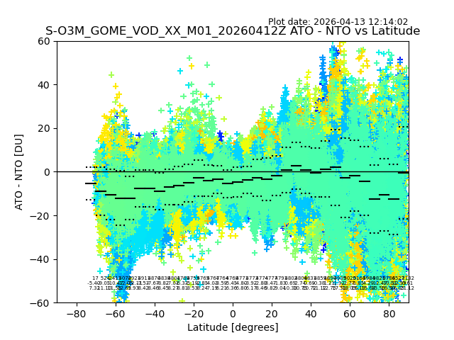 The date given in the title of the plot indicates the T=0 day for which the NTO/O3 data is compared. Example: S-O3M_GOME_VOD__M02_20110117Z indicates that the plot is for data from 2011-01-17 00:00 up NTO/O3 files starting at 2011-01-17 23:59 is used.