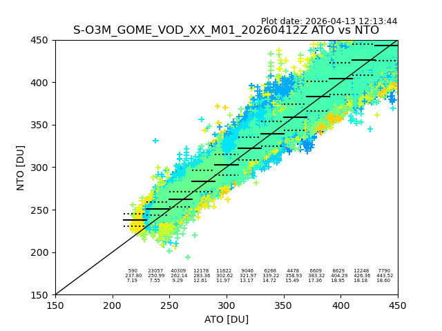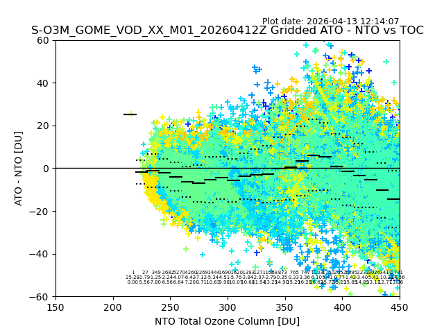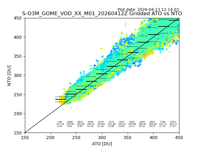 Using these forecast fields, the actual measured NTO/O3 from T=0 to T+24h can be compared. The comparison can be between each individual NTO/O3 retrieval and the ATO value in the associated grid box, or between 'pre-gridded' NTO/O3 values and the ATO value. Both these comparisons are given.